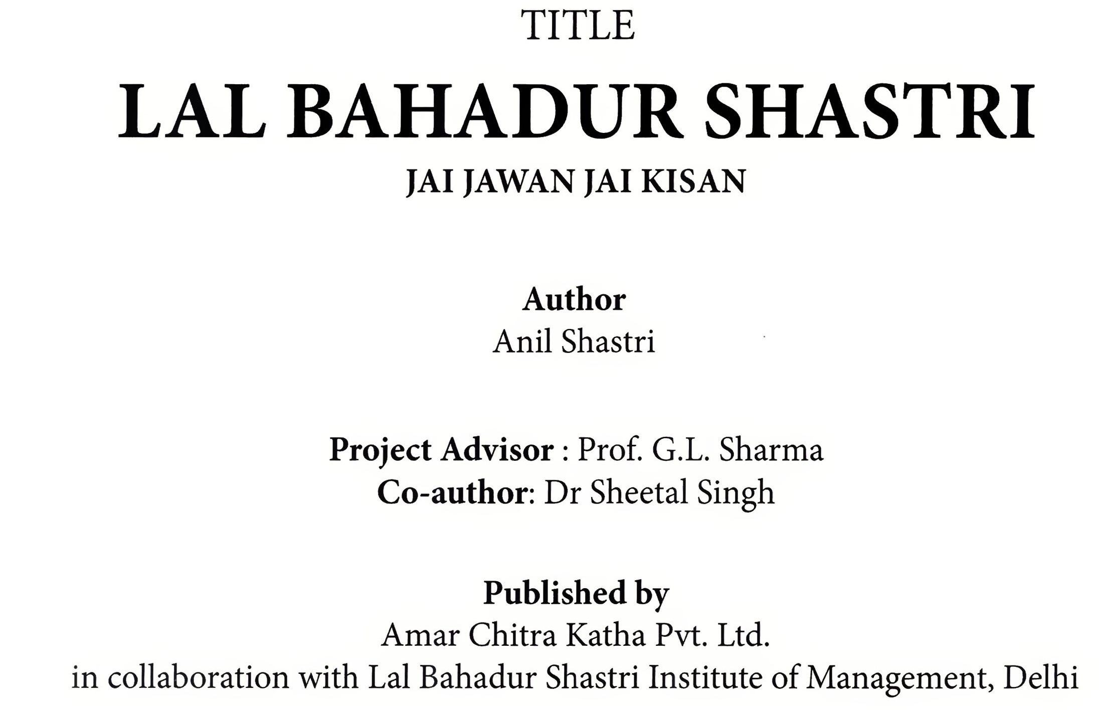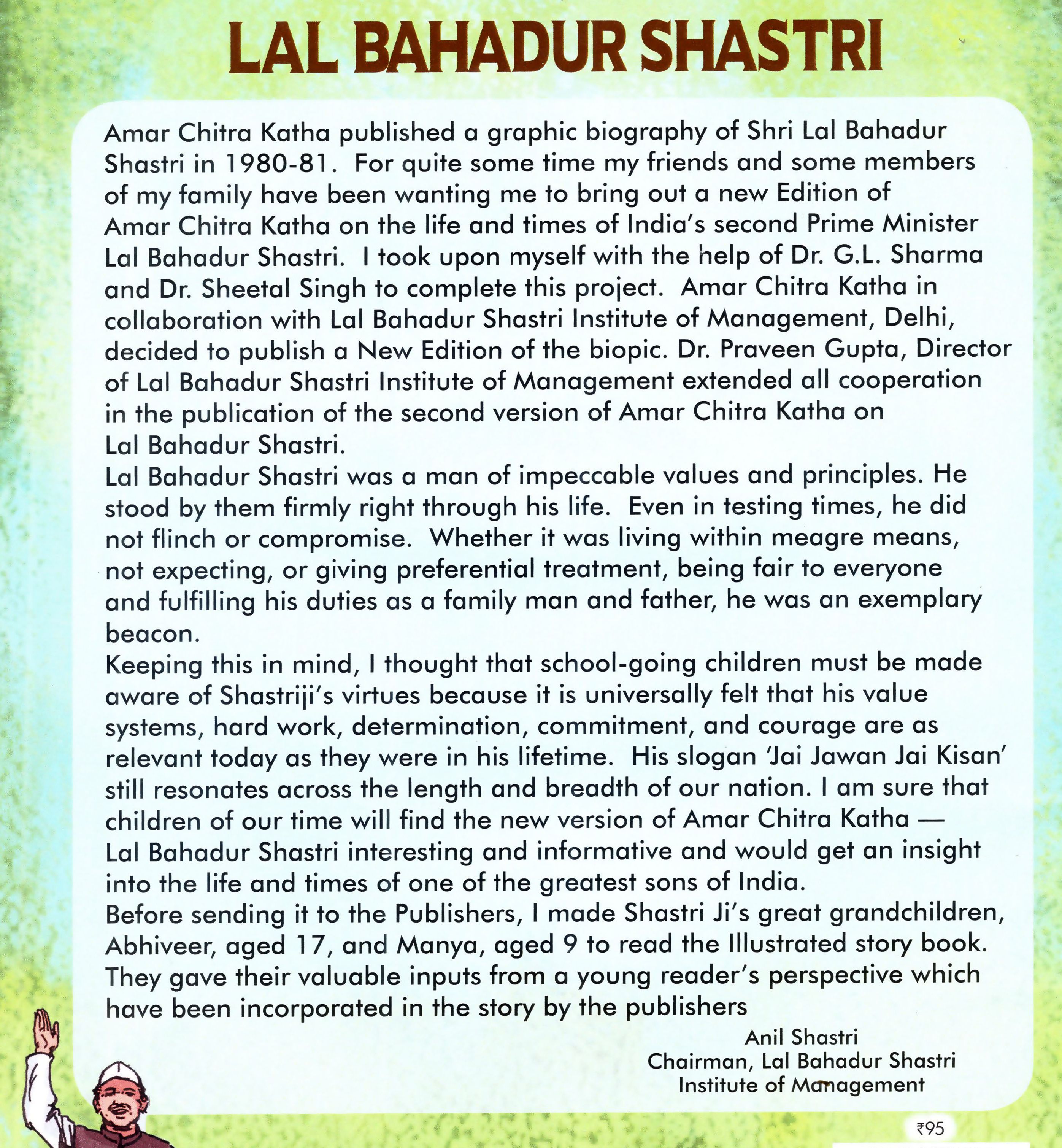 Amar Chitra Katha published a graphic biography of Shri Lal Bahadur Shastri in 1980-81. For quite some time my friends and some members of my family have been wanting me to bring out a new Edition of Amar Chitra Katha on the life and times of India's second Prime Minister Lal Bahadur Shastri. I took upon myself with the help of Dr. G.L. Sharma and Dr. Sheetal Singh to complete this project. Amar Chitra Katha in collaboration with Lal Bahadur Shastri Institute of Management, Delhi, decided to publish a New Edition of the biopic. Dr. Praveen Gupta, Director of Lal Bahadur Shastri Institute of Management extended all cooperation in the publication of the second version of Amar Chitra Katha on Lal Bahadur Shastri.