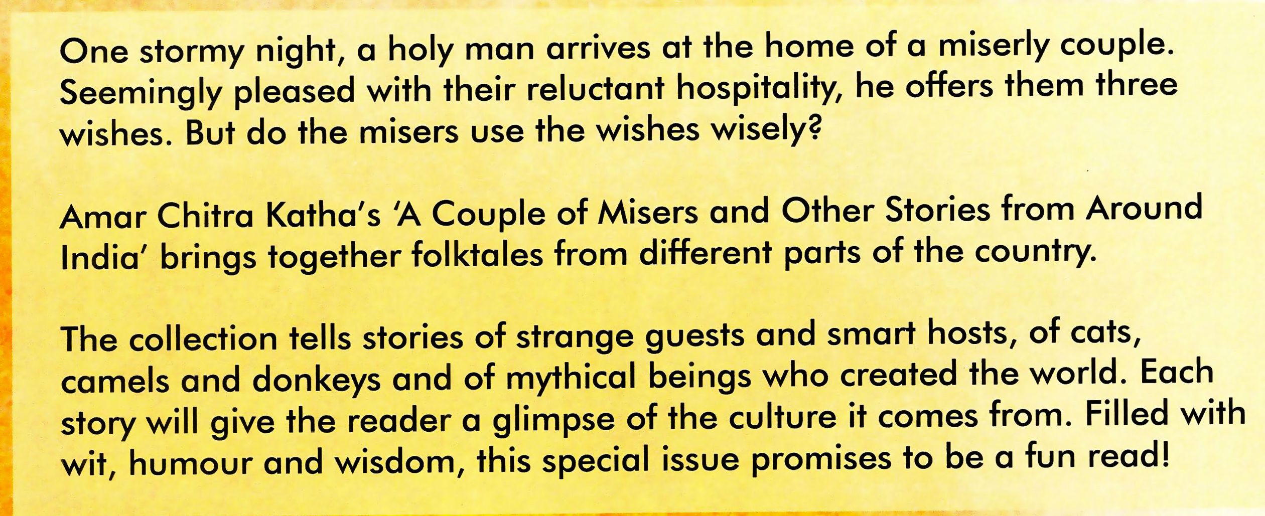 One stormy night, a holy man arrives at the home of a miserly couple. Seemingly pleased with their reluctant hospitality, he offers them three wishes. But do the misers use the wishes wisely? Amar Chitra Katha’s ‘A Couple of Misers and Other Stories from Around India’ brings together folktales from different parts of the country. The collection tells stories of strange guests and smart hosts, of cats, camels and donkeys and of mythical beings who created the world. Each story will give the reader a glimpse of the culture it comes from. Filled with wit, humour and wisdom, this special issue promises to be a fun read!