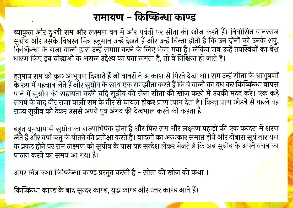 सुग्रीव वर्षा ऋतु के कारण तुरंत खोज शुरू नहीं करता, जिससे राम थोड़े चिंतित होते हैं। ऋतु समाप्त होने के बाद, सुग्रीव अपनी वानर सेना को चारों दिशाओं में भेजता है। हनुमान, अंगद और जाम्बवन्त दक्षिण दिशा में जाते हैं। अंत में किष्किंधा (आज का हम्पी क्षेत्र) का सुंदर वर्णन किया गया है यह वानरों की समृद्ध नगरी थी, जहाँ पर्वत, गुफाएँ और प्राकृतिक सौंदर्य भरपूर था। यह कॉमिक्स हमें मुख्य सन्देश देता है कि मित्रता और विश्वास का महत्व, धर्म और न्याय की स्थापना, बुराई पर अच्छाई की विजय तथा सही समय पर सही निर्णय लेना चाहिए!