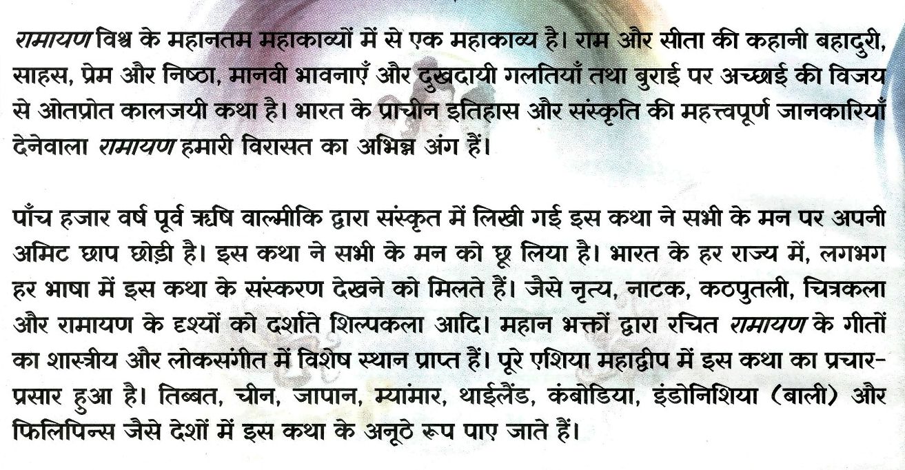 रामायण विश्व के महानतम महाकाव्यों में से एक महाकाव्य है। राम और सीता की कहानी बहादुरी, साहस, प्रेम और निष्ठा, मानवी भावनाएं और दुखदायी गलतियां तथा बुराई पर अच्छाई की विजय से ओतप्रोत कालजयी कथा है। भारत के प्राचीन इतिहास और संस्कृति की महत्त्वपूर्ण जानकारियां देनेवाला रामायण हमारी विरासत का अभिन्न अंग है। पाँच हजार वर्ष पूर्व ऋषि वाल्मीकि द्वारा संस्कृत में लिखी गई इस कथा ने सभी के मन पर अपनी अमिट छाप छोड़ी है। इस कथा ने सभी के मन को छू लिया है। भारत के हर राज्य में, लगभग हर भाषा में इस कथा के संस्करण देखने को मिलते हैं। जैसे नृत्य, नाटक, कठपुतली, चित्रकला और रामायण के दृश्यों को दर्शाते शिल्पकला | महान भक्तों द्वारा रचित रामायण के गीतों को शास्त्रीय और लोकसंगीत में विशेष स्थान प्राप्त हैं। पूरे एशिया महाद्वीप में इस कथा का प्रचार-प्रसार हुआ है। तिब्बत, चीन, जापान, म्यांमार, थाईलैंड, कंबोडिया, इंडोनिशिया (बाली) और फिलिपिन्स जैसे देशों में इस कथा के अनूठे रूप पाए जाते हैं। अमर चित्र कथा द्वारा ये पुनर्कथन वाल्मीकि रचित मौलिक महाकाव्य पर आधारित है जिसमें सात काण्ड या पुस्तकें हैं, जिनमें 645 अध्याय समाविष्ट हैं।