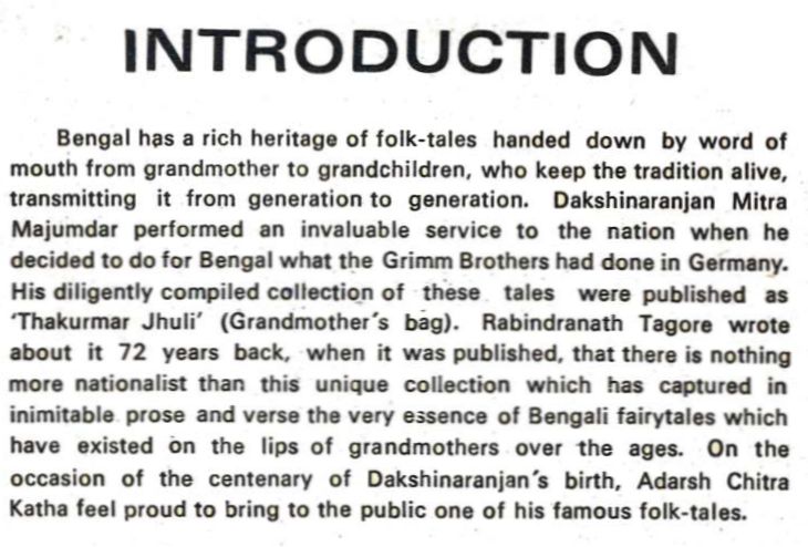 Bengal has a rich heritage of folk-tales handed down by word of mouth from grandmother to grandchildren, who keep the tradition alive, transmitting it from generation to generation. Dakshinaranjan Mitra Majumdar performed an invaluable service to the nation when he decided to do for Bengal what the Grimm Brothers had done in Germany. His diligently compiled collection of these tales were published as 'Thakurmar Jhuli' (Grandmother's bag). Rabindranath Tagore wrote about it 72 years back, when it was published, that there is nothing more nationalist than this unique collection which has captured in inimitable prose and verse the very essence of Bengali fairytales which have existed on the lips of grandmothers over the ages. On the occasion of the centenary of Dakshinaranjan's birth, Adarsh Chitra Katha feel proud to bring to the public one of his famous folk-tales.
