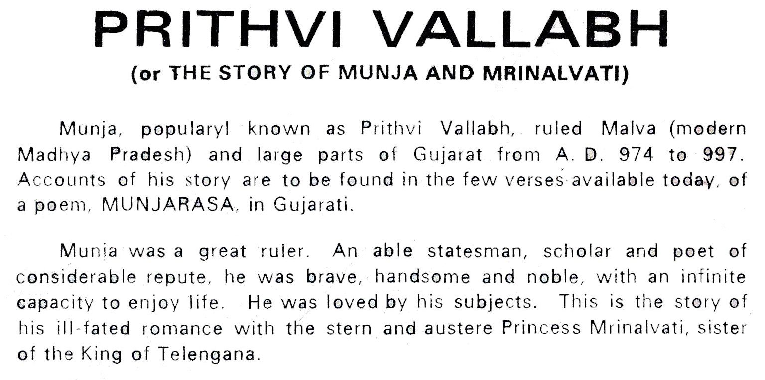 Munja, popularyl known as Prithvi Vallabh, ruled Malva (modern Madhya Pradesh) and large parts of Gujarat from A. D. 974 to 997. Accounts of his story are to be found in the few verses available today, of a poem, MUNJARASA, in Gujarati. Munia was a great ruler. An able statesman, scholar and poet of considerable repute, he was brave, handsome and noble, with an infinite capacity to enjoy life. He was loved by his subjects. This is the story of his ill-fated romance with the stern and austere Princess Mrinalvati, sister of the King of Telengana.