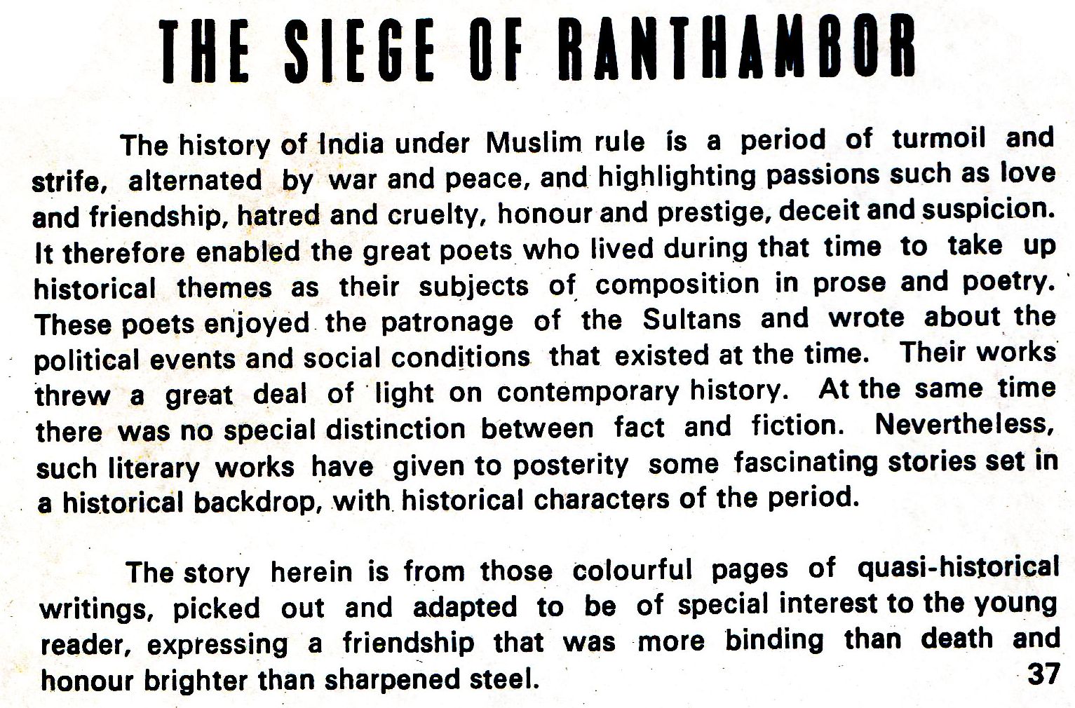 The history of India under Muslim rule is a period of turmoil and strife, alternated by war and peace, and highlighting passions such as love and friendship, hatred and cruelty, honour and prestige, deceit and suspicion. It therefore enabled the great poets who lived during that time to take up historical themes as their subjects of composition in prose and poetry. These poets enjoyed the patronage of the Sultans and wrote about the political events and social conditions that existed at the time. Their works threw a great deal of light on contemporary history. At the same time there was no special distinction between fact and fiction. Nevertheless, such literary works have given to posterity some fascinating stories set in a historical backdrop, with historical characters of the period.