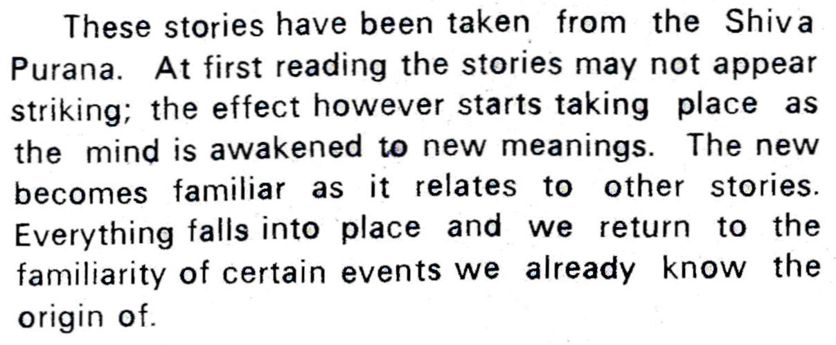These stories have been taken from the Shiva Purana. At first reading the stories may not appear striking; the effect however starts taking place as the mind is awakened to new meanings. The new becomes familiar as it relates to other stories. Everything falls into place and we return to the familiarity of certain events we already know the origin of.