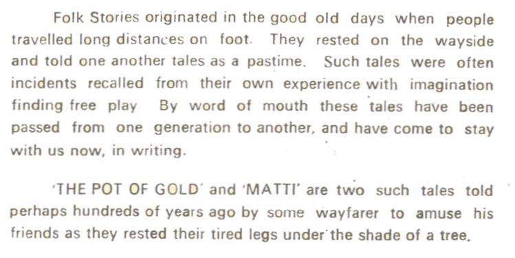 'THE POT OF GOLD' and 'MATTI' are two such tales told perhaps hundreds of years ago by some wayfarer to amuse his friends as they rested their tired legs under the shade of a tree.
