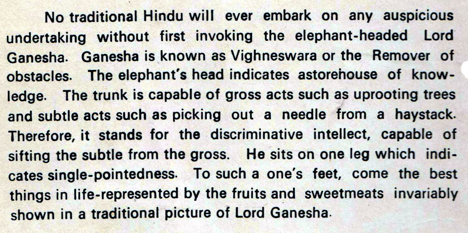 No traditional Hindu will ever embark on any auspicious undertaking without first invoking the elephant-headed Lord Ganesha. Ganesha is known as Vighneswara or the Remover of obstacles. The elephant's head indicates astorehouse of know- ledge. The trunk is capable of gross acts such as uprooting trees and subtle acts such as picking out a needle from a haystack. Therefore, it stands for the discriminative intellect, capable of sifting the subtle from the gross. He sits on one leg which indicates single-pointedness. To such a one's feet, come the best things in life-represented by the fruits and sweetmeats invariably shown in a traditional picture of Lord Ganesha.