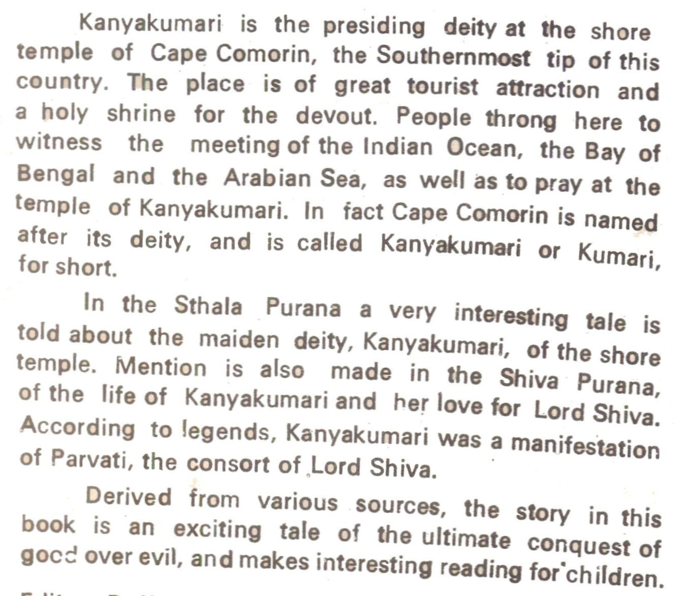 Kanyakumari is the presiding deity at the shore temple of Cape Comorin, the Southernmost tip of this country. The place is of great tourist attraction and a holy shrine for the devout. People throng here to witness the meeting of the Indian Ocean, the Bay of Bengal and the Arabian Sea, as well as to pray at the temple of Kanyakumari. In fact Cape Comorin is named after its deity, and is called Kanyakumari or Kumari, for short. In the Sthala Purana a very interesting tale is told about the maiden deity, Kanyakumari, of the shore temple. Mention is also made in the Shiva Purana, of the life of Kanyakumari and her love for Lord Shiva. According to legends, Kanyakumari was a manifestation of Parvati, the consort of Lord Shiva.