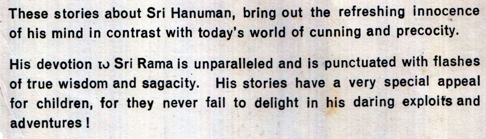 These stories about Sri Hanuman, bring out the refreshing innocence. of his mind in contrast with today's world of cunning and precocity. His devotion to Sri Rama is unparalleled and is punctuated with flashes of true wisdom and sagacity. His stories have a very special appeal for children, for they never fail to delight in his daring exploits and adventures!