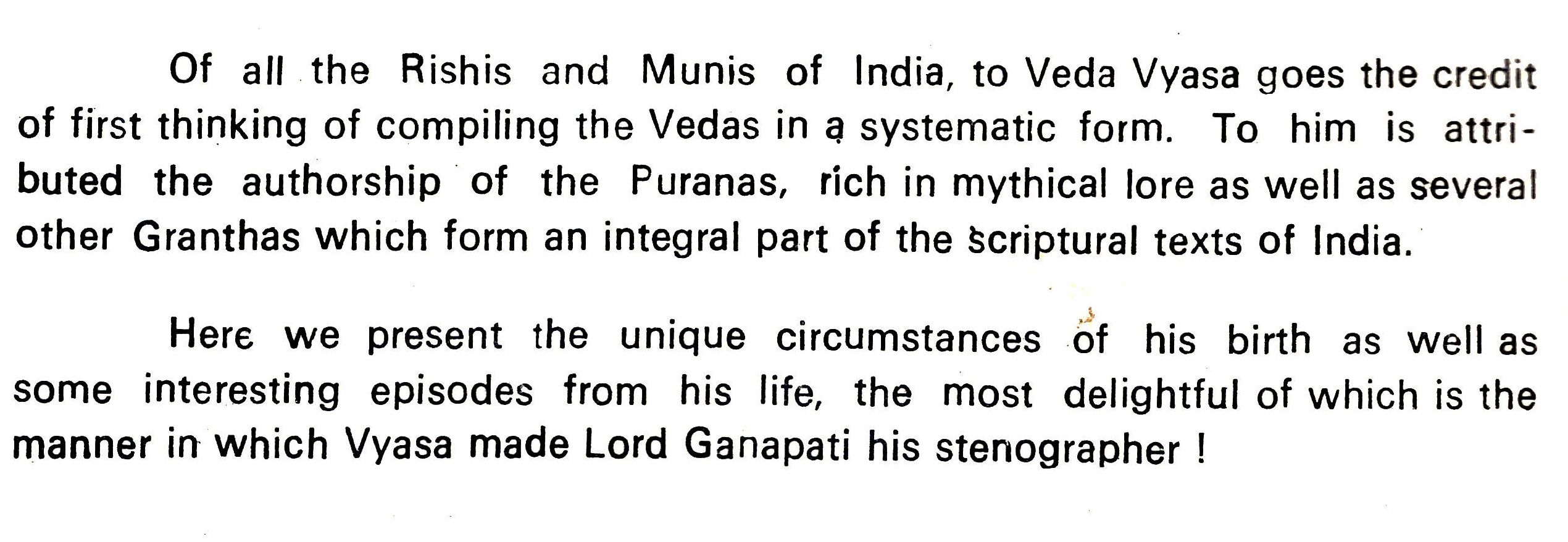 Of all the Rishis and Munis of India, to Veda Vyasa goes the credit of first thinking of compiling the Vedas in a systematic form. To him is attri- buted the authorship of the Puranas, rich in mythical lore as well as several other Granthas which form an integral part of the scriptural texts of India. Adarsh Chitra Katha present the unique circumstances of his birth as well as some interesting episodes from his life, the most delightful of which is the manner in which Vyasa made Lord Ganapati his stenographer!