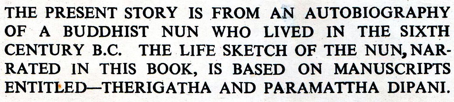 THE PRESENT STORY IS FROM AN AUTOBIOGRAPHY OF A BUDDHIST NUN WHO LIVED IN THE SIXTH CENTURY B.C. THE LIFE SKETCH OF THE NUN, NAR- RATED IN THIS BOOK, IS BASED ON MANUSCRIPTS ENTITLED-THERIGATHA AND PARAMATTHA DIPANI.