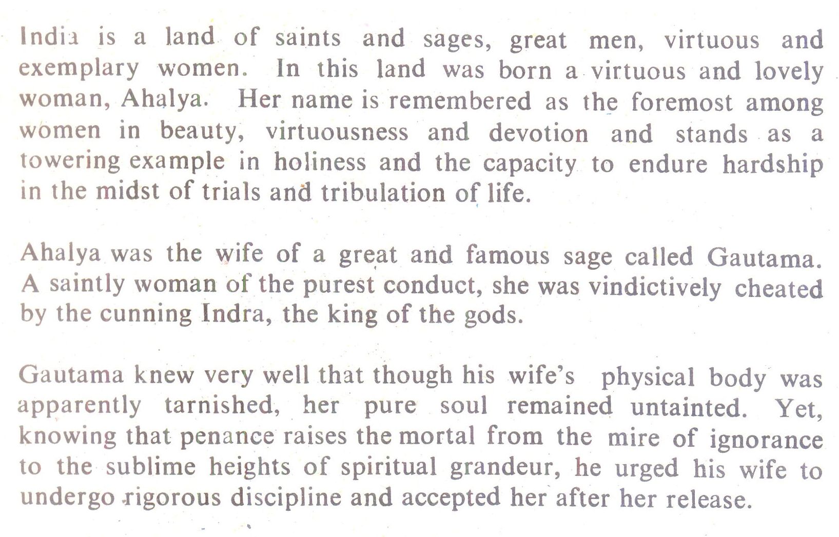 India is a land of saints and sages, great men, virtuous and exemplary women. In this land was born a virtuous and lovely woman, Ahalya. Her name is remembered as the foremost among women in beauty, virtuousness and devotion and stands as a towering example in holiness and the capacity to endure hardship in the midst of trials and tribulation of life. Ahalya was the wife of a great and famous sage called Gautama. A saintly woman of the purest conduct, she was vindictively cheated by the cunning Indra, the king of the gods. Gautama knew very well that though his wife's physical body was apparently tarnished, her pure soul remained untainted. Yet, knowing that penance raises the mortal from the mire of ignorance to the sublime heights of spiritual grandeur, he urged his wife to undergo rigorous discipline and accepted her after her release.