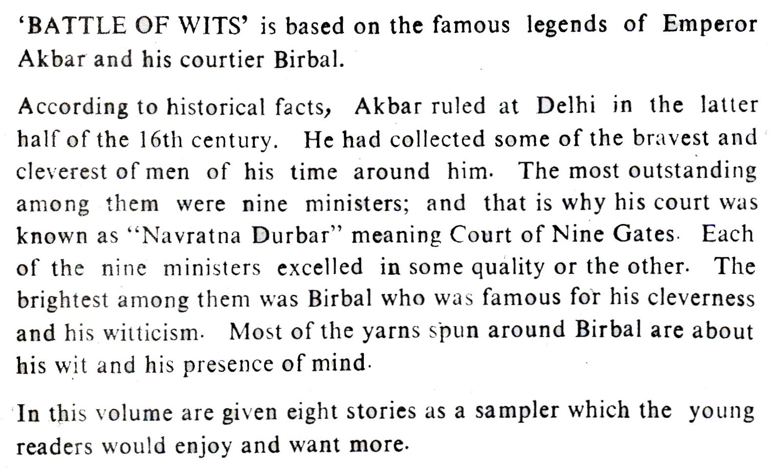 'BATTLE OF WITS' is based on the famous legends of Emperor Akbar and his courtier Birbal. According to historical facts, Akbar ruled at Delhi in the latter half of the 16th century. He had collected some of the bravest and cleverest of men of his time around him. The most outstanding among them were nine ministers; and that is why his court was known as "Navratna Durbar" meaning Court of Nine Gates. Each of the nine ministers excelled in some quality or the other. The brightest among them was Birbal who was famous for his cleverness and his witticism. Most of the yarns spun around Birbal are about his wit and his presence of mind. In this volume are given eight stories as a sampler which the young readers would enjoy and want more.