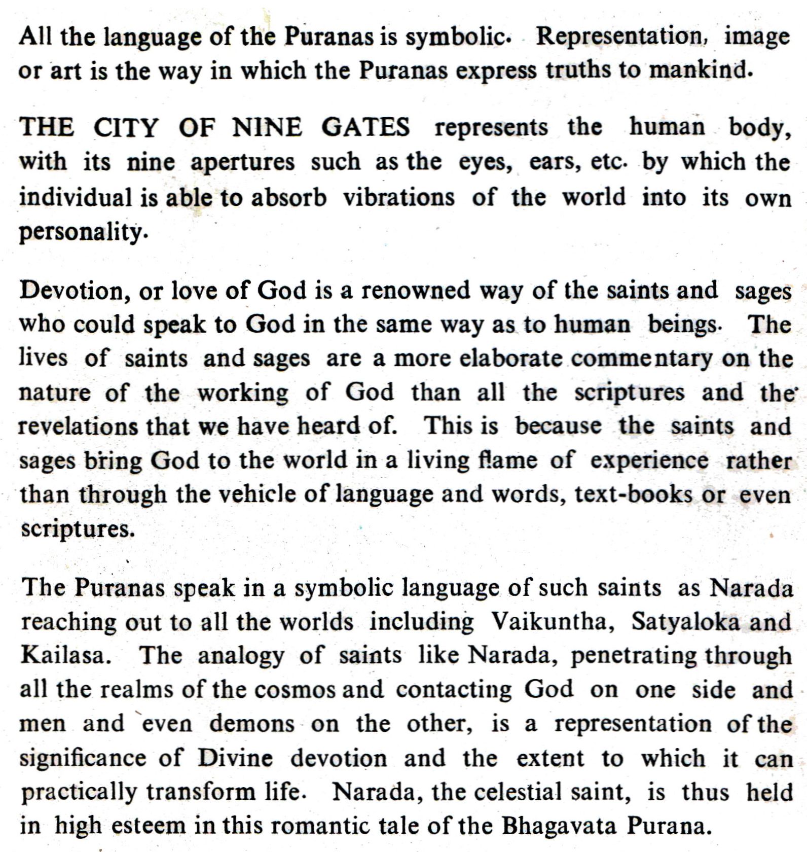 The Puranas speak in a symbolic language of such saints as Narada reaching out to all the worlds including Vaikuntha, Satyaloka and Kailasa. The analogy of saints like Narada, penetrating through all the realms of the cosmos and contacting God on one side and men and even demons on the other, is a representation of the significance of Divine devotion and the extent to which it can practically transform life. Narada, the celestial saint, is thus held in high esteem in this romantic tale of the Bhagavata Purana.