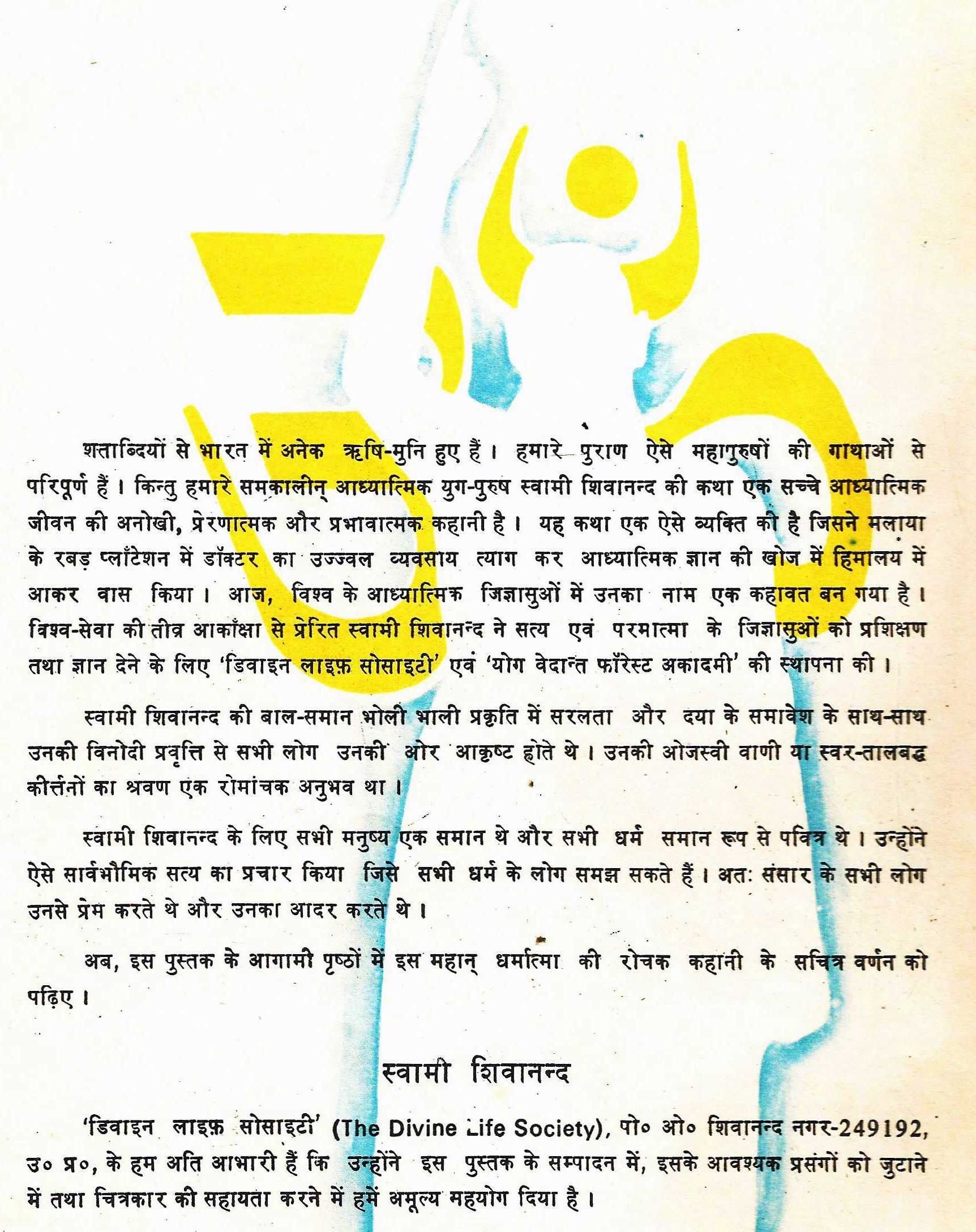 स्वामी शिवानन्द 'डिवाइन लाइफ़ सोसाइटी' (The Divine Life Society), पो० ओ० शिवानन्द नगर- 249192, उ० प्र०, के हम अति आभारी हैं कि उन्होंने इस पुस्तक के सम्पादन में, इसके आवश्यक प्रसंगों को जुटाने में तथा चित्रकार की सहायता करने में हमें अमूल्य महयोग दिया है।