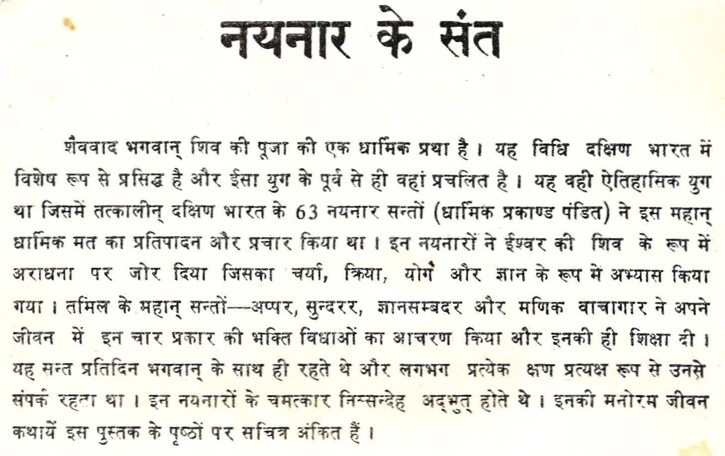 शैववाद भगवान् शिव की पूजा की एक धार्मिक प्रथा है। यह विधि दक्षिण भारत में विशेष रूप से प्रसिद्ध है और ईसा युग के पूर्व से ही वहां प्रचलित है। यह वही ऐतिहासिक युग था जिसमें तत्कालीन् दक्षिण भारत के 63 नयनार सन्तों (धार्मिक प्रकाण्ड पंडित) ने इस महान् धार्मिक मत का प्रतिपादन और प्रचार किया था। इन नयनारों ने ईश्वर की शिव के रूप में अराधना पर जोर दिया जिसका चर्या, क्रिया, योग और ज्ञान के रूप में अभ्यास किया गया। तमिल के महान् सन्तों- अप्पर, सुन्दरर, ज्ञानसम्बदर और मणिक वाचागार ने अपने जीवन में इन चार प्रकार की भक्ति विधाओं का आचरण किया और इनकी ही शिक्षा दी। यह सन्त प्रतिदिन भगवान् के साथ ही रहते थे और लगभग प्रत्येक क्षण प्रत्यक्ष रूप से उनसे संपर्क रहता था। इन नयनारों के चमत्कार निम्सन्देह अद्भुत होते थे। इनकी मनोरम जीवन कथायें इस पुस्तक के पृष्ठों पर सचित्र अंकित हैं।