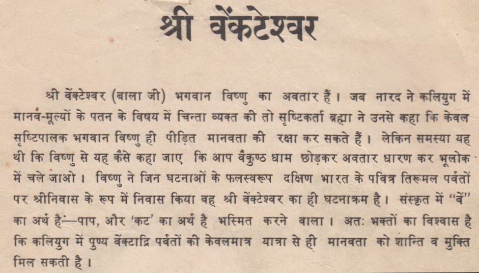 श्री वेंकटेश्वर (बाला जी) भगवान विष्णु का अवतार हैं। जब नारद ने कलियुग में मानव मूल्यों के पतन के विषय में चिन्ता व्यक्त की तो सृष्टिकर्ता ब्रह्मा ने उनसे कहा कि केवल सृष्टिपालक भगवान विष्णु ही पीड़ित मानवता की रक्षा कर सकते हैं। लेकिन समस्या यह थी कि विष्णु से यह कैसे कहा जाए कि आप वैकुण्ठ धाम छोड़कर अवतार धारण कर भूलोक में चले जाओ। विष्णु ने जिन घटनाओं के फलस्वरूप दक्षिण भारत के पवित्र तिरूमल पर्वतों पर श्रीनिवास के रूप में निवास किया वह श्री वेंकटेश्वर का ही घटनाक्रम है। संस्कृत में "वें" का अर्थ है—पाप, और 'कट' का अर्थ है भस्मित करने वाला। अतः भक्तों का विश्वास है कि कलियुग में पुण्य वेंकटाद्रि पर्वतों की केवलमात्र यात्रा से ही मानवता को शान्ति व मुक्ति मिल सकती है।