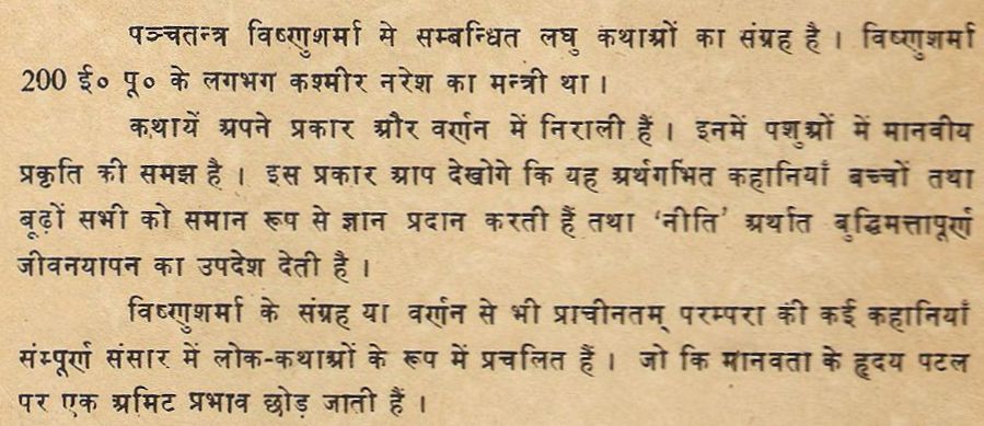 पञ्चतन्त्र विष्णुशर्मा मे सम्बन्धित लघु कथाओंों का संग्रह है। विष्णुशर्मा 200 ई० पू० के लगभग कश्मीर नरेश का मन्त्री था। कथायें अपने प्रकार और वर्णन में निराली हैं। इनमें पशुओं में मानवीय प्रकृति की समझ है। इस प्रकार आप देखोगे कि यह अर्थगभित कहानियाँ बच्चों तथा बूढ़ों सभी को समान रूप से ज्ञान प्रदान करती हैं तथा 'नीति' अर्थात बुद्धिमत्तापूर्ण जीवनयापन का उपदेश देती है। विष्णुशर्मा के संग्रह या वर्णन से भी प्राचीनतम् परम्परा की कई कहानियाँ संम्पूर्ण संसार में लोक-कथाओं के रूप में प्रचलित हैं। जो कि मानवता के हृदय पटल पर एक अमिट प्रभाव छोड़ जाती हैं।
