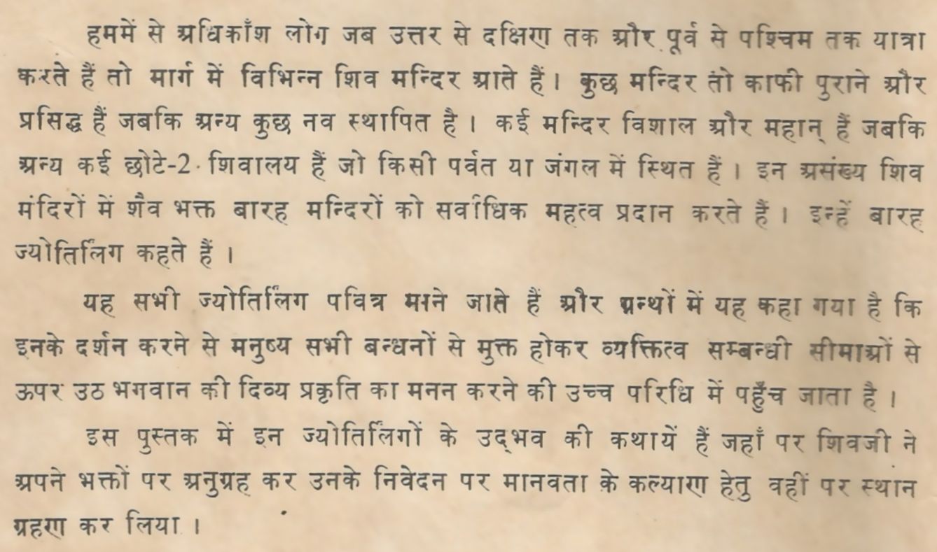 हममें से अधिकाँश लोग जब उत्तर से दक्षिण तक और पूर्व से पश्चिम तक यात्रा करते हैं, तो मार्ग में विभिन्न शिव मन्दिर आते हैं। कुछ मन्दिर तो काफी पुराने और प्रसिद्ध हैं जबकि अन्य कुछ नव स्थापित है। कई मन्दिर विशाल और महान् हैं, जबकि अन्य कई छोटे-छोटे शिवालय हैं जो किसी पर्वत या जंगल में स्थित हैं। इन असंख्य शिव मंदिरों में शैव भक्त बारह मन्दिरों को सर्वाधिक महत्व प्रदान करते हैं। इन्हें बारह ज्योतिर्लिंग कहते हैं। यह सभी ज्योतिलिंग पवित्र माने जाते हैं, और ग्रन्थों में यह कहा गया है कि इनके दर्शन करने से मनुष्य सभी बन्धनों से मुक्त होकर व्यक्तित्व सम्बन्धी सीमाओं से ऊपर उठ भगवान की दिव्य प्रकृति का मनन करने की उच्च परिधि में पहुँच जाता है।