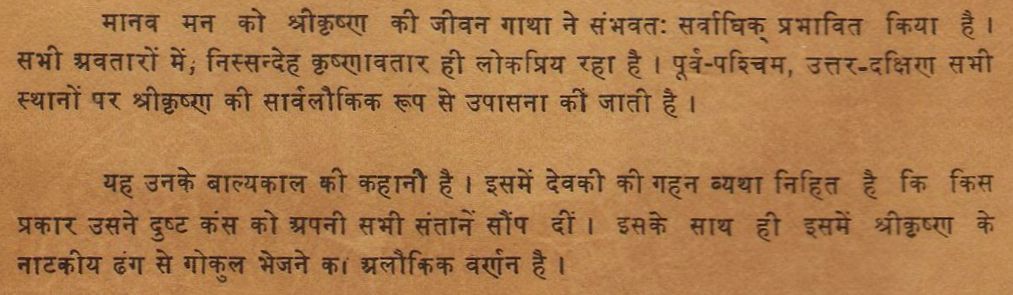 यह उनके बाल्यकाल की कहानी है। इसमें देवकी की गहन व्यथा निहित है कि किस प्रकार उसने दुष्ट कंस को अपनी सभी संतानें सौंप दीं। इसके साथ ही इसमें श्रीकृष्ण के नाटकीय ढंग से गोकुल भेजने का अलौकिक वर्णन है।