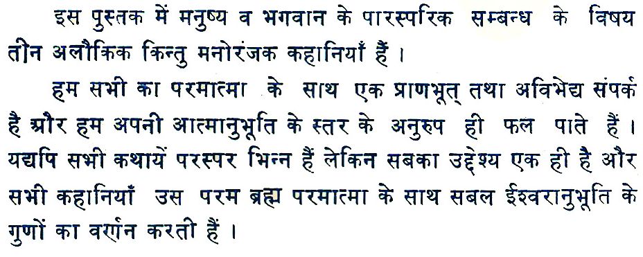 इस पुस्तक में मनुष्य व भगवान के पारस्परिक सम्बन्ध के विषय तीन अलौकिक किन्तु मनोरंजक कहानियाँ हैं। हम सभी का परमात्मा के साथ एक प्राणभूत् तथा अविभेद्य संपर्क है और हम अपनी आत्मानुभूति के स्तर के अनुरुप ही फल पाते हैं। यद्यपि सभी कथायें परस्पर भिन्न हैं लेकिन सबका उद्देश्य एक ही है और सभी कहानियाँ उस परम ब्रह्म परमात्मा के साथ सबल ईश्वरानुभूति के गुणों का वर्णन करती हैं।