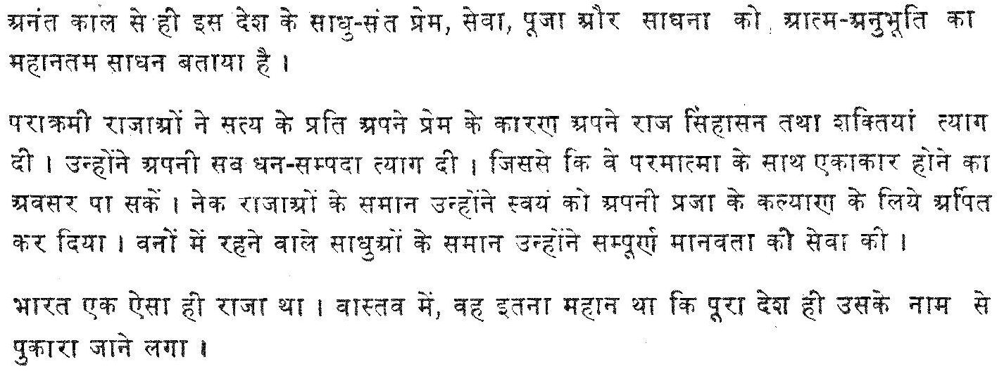 अनंत काल से ही इस देश के साधु-संत प्रेम, सेवा, पूजा और साधना को ग्रात्म अनुभूति का महानतम साधन बताया है। पराक्रमी राजाओं ने सत्य के प्रति अपने प्रेम के कारण अपने राज सिंहासन तथा शक्तियां त्याग दी। उन्होंने अपनी सब धन-सम्पदा त्याग दी। जिससे कि वे परमात्मा के साथ एकाकार होने का अवसर पा सकें। नेक राजाओं के समान उन्होंने स्वयं को अपनी प्रजा के कल्याण के लिये अर्पित कर दिया। वनों में रहने वाले साधुयों के समान उन्होंने सम्पूर्ण मानवता की सेवा की। भारत एक ऐसा ही राजा था, वास्तव में, वह इतना महान था कि पूरा देश ही उसके नाम से पुकारा जाने लगा।
