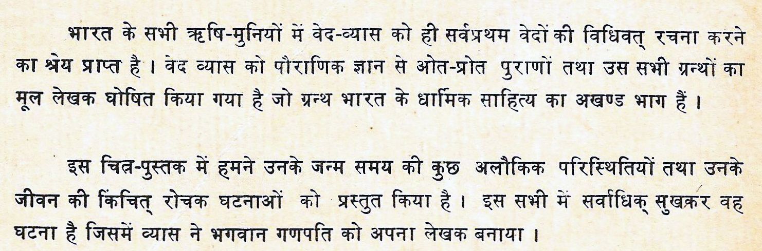 भारत के सभी ऋषि-मुनियों में वेद व्यास को ही सर्वप्रथम वेदों की विधिवत् रचना करने का श्रेय प्राप्त है। वेद व्यास को पौराणिक ज्ञान से ओत-प्रोत पुराणों तथा उस सभी ग्रन्थों का मूल लेखक घोषित किया गया है जो ग्रन्थ भारत के धार्मिक साहित्य का अखण्ड भाग हैं। इस चित्र पुस्तक में हमने उनके जन्म समय की कुछ अलौकिक परिस्थितियों तथा उनके जीवन की किंचित् रोचक घटनाओं को प्रस्तुत किया है। इस सभी में सर्वाधिक सुखकर वह घटना है जिसमें व्यास ने भगवान गणपति को अपना लेखक बनाया।