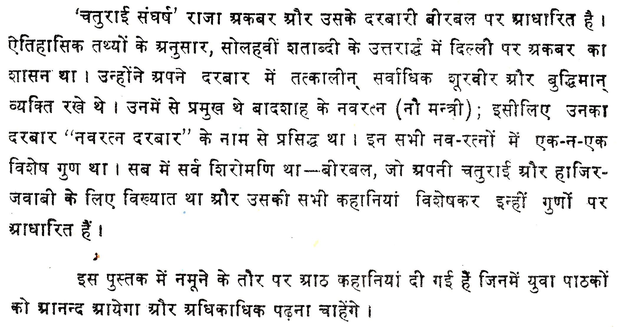 चतुराई संघर्ष' राजा अकबर और उसके दरबारी बीरबल पर प्राधारित है। ऐतिहासिक तथ्यों के अनुसार, सोलहवीं शताब्दी के उत्तरार्द्ध में दिल्ली पर अकबर का शासन था। उन्होंने अपने दरबार में तत्कालीन् सर्वाधिक शूरवीर और बुद्धिमान् व्यक्ति रखे थे। उनमें से प्रमुख थे बादशाह के नवरत्न (नौ मन्त्री), इसीलिए उनका दरबार " नवरत्न दरबार" के नाम से प्रसिद्ध था। इन सभी नव रत्नों में एक न एक विशेष गुण था। सब में सर्व शिरोमणि था - बीरबल, जो अपनी चतुराई और हाजिर- जवाबी के लिए विख्यात था और उसकी सभी कहानियां विशेषकर इन्हीं गुणों पर प्राधारित हैं। इस पुस्तक में नमूने के तौर पर आठ कहानियां दी गई हैं जिनमें युवा पाठकों को प्रानन्द आयेगा और अधिकाधिक पढ़ना चाहेंगे।