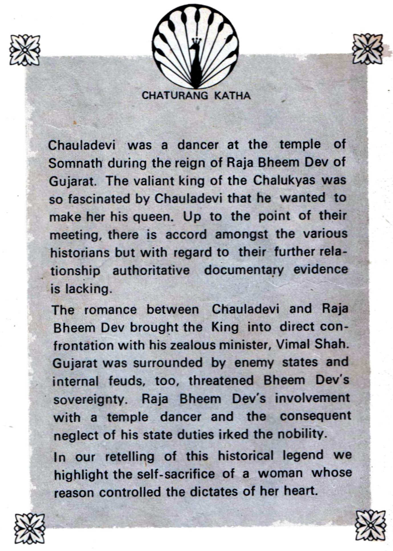 Chauladevi was a dancer at the temple of Somnath during the reign of Raja Bheem Dev of Gujarat. The valiant king of the Chalukyas was so fascinated by Chauladevi that he wanted to make her his queen. Up to the point of their meeting, there is accord amongst the various historians but with regard to their further rela- tionship authoritative documentary evidence is lacking. The romance between Chauladevi and Raja Bheem Dev brought the King into direct con- frontation with his zealous minister, Vimal Shah. Gujarat was surrounded by enemy states and internal feuds, too, threatened Bheem Dev's sovereignty. Raja Bheem Dev's involvement with a temple dancer and the consequent neglect of his state duties irked the nobility. In our retelling of this historical legend we highlight the self-sacrifice of a woman whose reason controlled the dictates of her heart.
