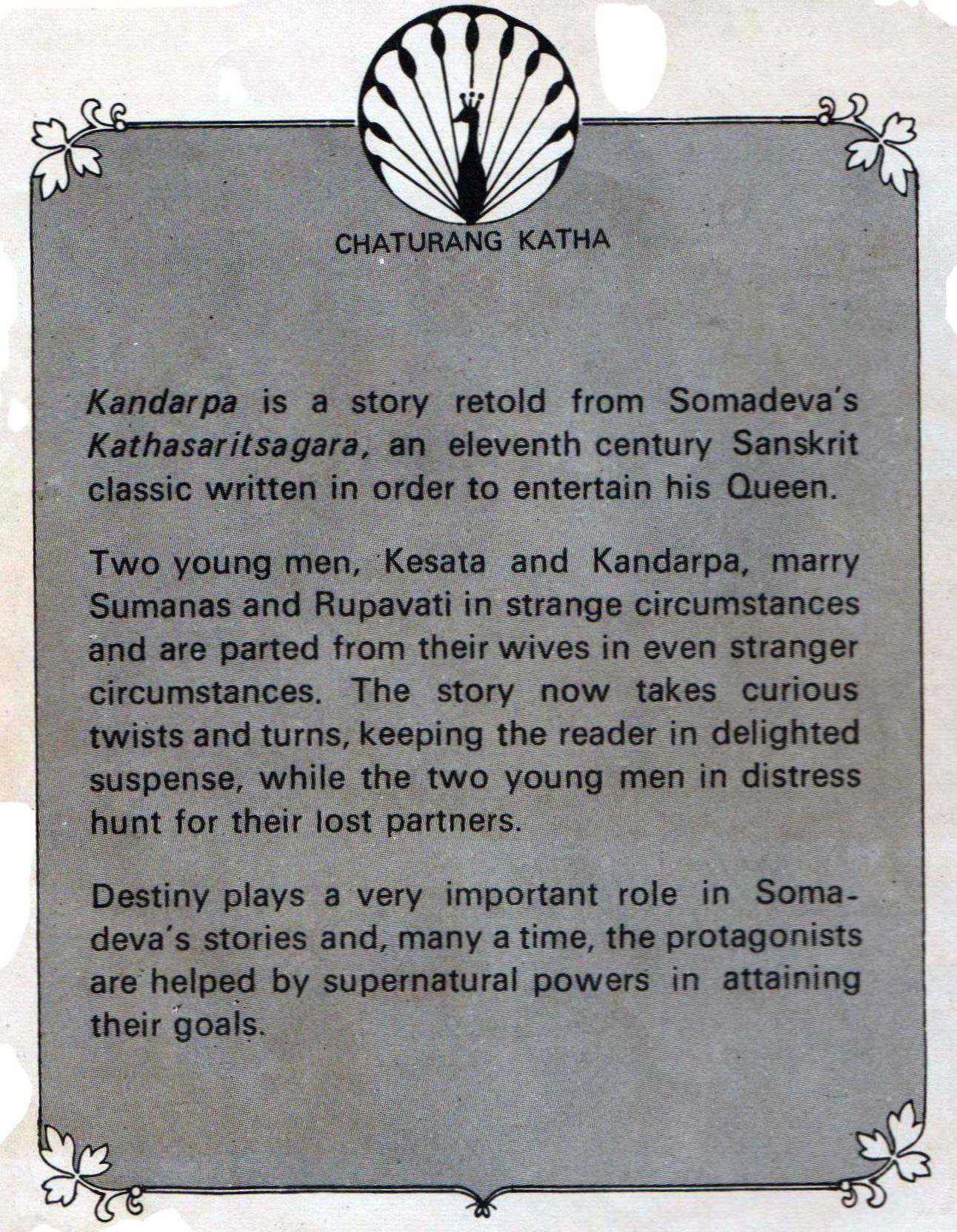 Kandarpa is a story retold from Somadeva's Kathasaritsagara, an eleventh century Sanskrit classic written in order to entertain his Queen. Two young men, Kesata and Kandarpa, marry Sumanas and Rupavati in strange circumstances and are parted from their wives in even stranger circumstances. The story now takes curious twists and turns, keeping the reader in delighted suspense, while the two young men in distress hunt for their lost partners. Destiny plays a very important role in Soma- deva's stories and, many a time, the protagonists are helped by supernatural powers in attaining their goals.