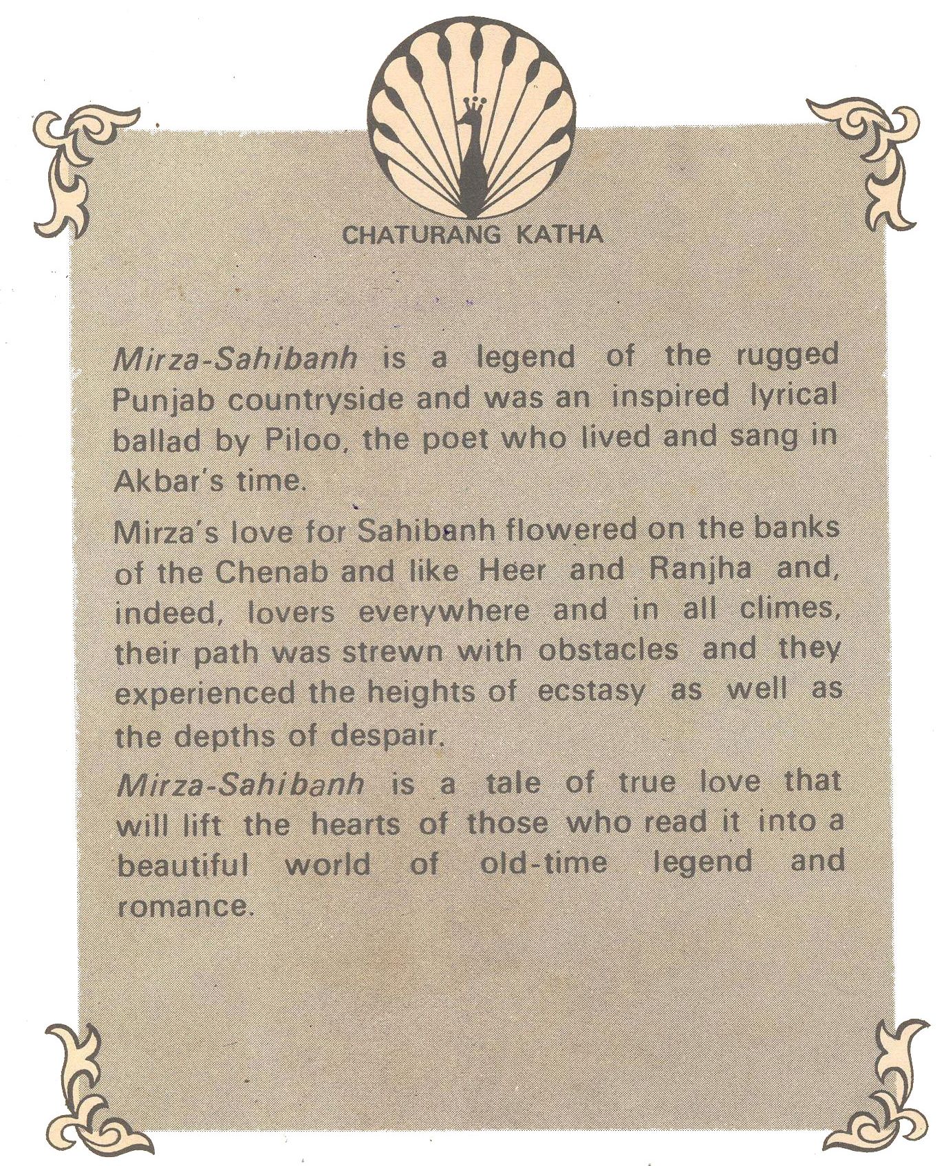 Mirza-Sahibanh is a legend of the rugged Punjab countryside and was an inspired lyrical ballad by Piloo, the poet who lived and sang in Akbar's time. Mirza's love for Sahibanh flowered on the banks of the Chenab and like Heer and Ranjha and, indeed, lovers everywhere and in all climes, their path was strewn with obstacles and they experienced the heights of ecstasy as well as the depths of despair. Mirza-Sahibanh is a tale of true love that will lift the hearts of those who read it into a beautiful world of old-time legend and romance.