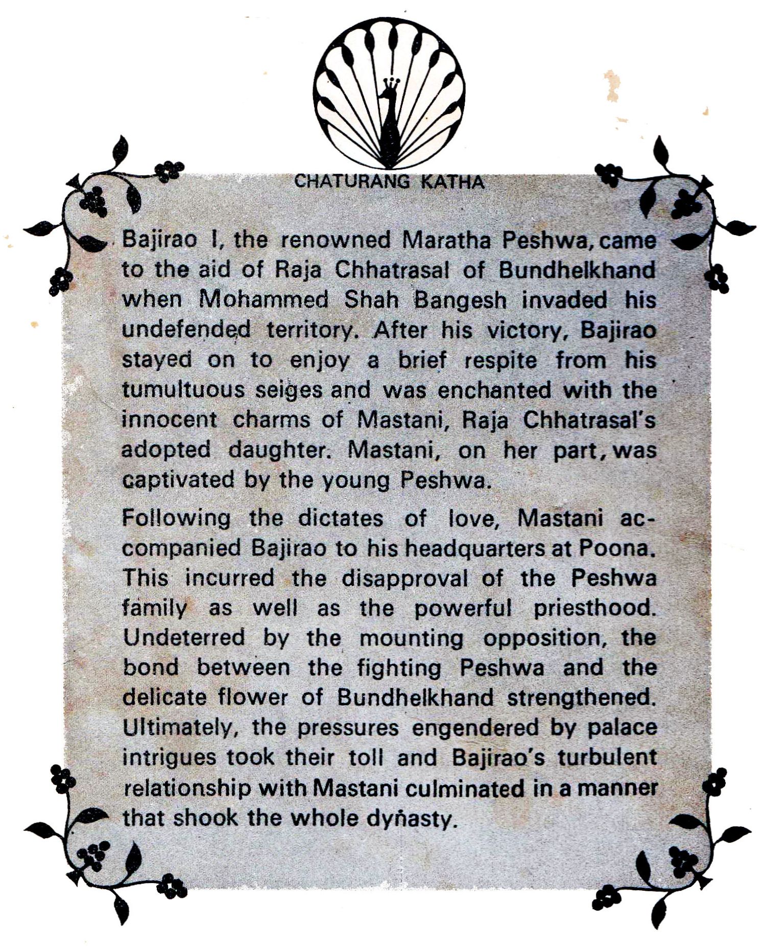 Bajirao I, the renowned Maratha Peshwa, came to the aid of Raja Chhatrasal of Bundhelkhand when Mohammed Shah Bangesh invaded his undefended territory. After his victory, Bajirao stayed on to enjoy a brief respite from his tumultuous seiges and was enchanted with the innocent charms of Mastani, Raja Chhatrasal's adopted daughter. Mastani, on her part, was captivated by the young Peshwa. Following the dictates of love, Mastani ac- companied Bajirao to his headquarters at Poona. This incurred the disapproval of the Peshwa family as well as the powerful priesthood. Undeterred by the mounting opposition, the bond between the fighting Peshwa and the delicate flower of Bundhelkhand strengthened. Ultimately, the pressures engendered by palace intrigues took their toll and Bajirao's turbulent relationship with Mastani culminated in a manner that shook the whole dynasty.