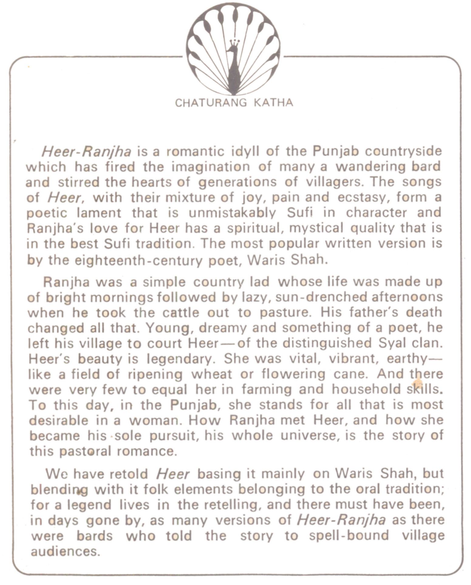HEER-RANJHA is a romantic idyll of the Punjab countryside which has fired the imagination of villagers. The Songs of Heer, their mixture of joy, pain and ecstasy, from a poetic lament that is mixture of joy, pain and ecstasy, from a poetic lamnet that is unmistakably. Sufi in charactor and Ranjha's love for heer has as a spritual, mystical quality that is in the best Sufi tradition. The most popular written version is by the eighteenth-century poet, Waris Shah.Ranjha was a simple country lad whose life was made up of bright mornings followed by lazy, sun-drenched afternoons when he took the cattle out to pasture. His father's death changed all that. Young, dreamy and something of a poet, he left his village to court Heer - of the distinguished Syal clan. Heer's beauty is legendary. She was vital, vibrant, earthy like a field of ripening wheat or flowering cane. And there were very few to equal her in farming and household skills. To this day, in the Punjab, She stands for all that is most desirable in a woman. How Ranjha meet Heer, and how she became his sole pursuit, his whole universe, is the story of this pastoral romance. We have retold Heer basing it mainly on Waris Shah, but blending with it folk elements belonging to the oral tradition. in days gone by, as many versions of Heer-Ranjha as there were bards who told the story of spell-bound village audiences.