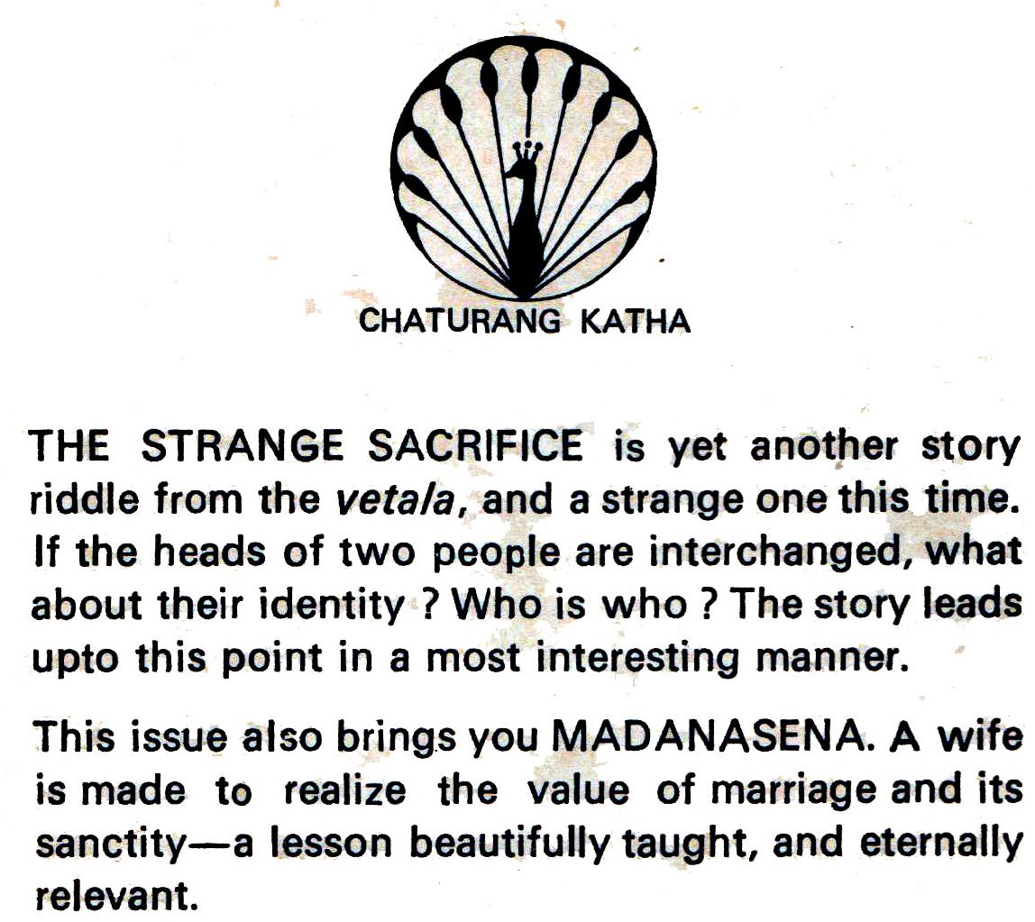THE STRANGE SACRIFICE is yet another story riddle from the vetala, and a strange one this time. If the heads of two people are interchanged, what about their identity? who is who? The Story leads pto this point in a most interesting manner. This issue also brings you MADANASENA. A wife is made to realize the value of marriage and its sanctity- a lesson beautifully taught, and eternally relevant.