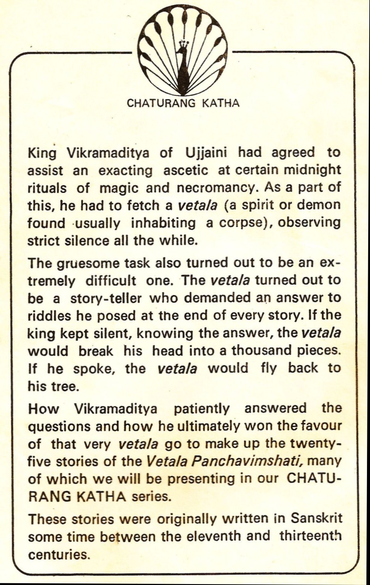 King Vikrmaditya of Ujjaini had agreed to assist an exacting ascetic at certain midnight rituals of magic and necromancy. As a part of this, he had to fetch a vetala (a spirit of demon found usually inhabiting a corpse), observing strict silence all the while. The gruesome task also turned out to be an extremely difficult one. The vetala turned out to be a story-teller who demanded an answer to riddles he posed at the end of every story. If the king kept silent, knowing the answer, the vetala would break his head into a thousand pieces. If he spoke, the vetala would fly back to his tree. How Vikramaditya patiently answered the questions and how he ultimately won the favour of that very vetala Panchavimshati, many of Which we will Presenting in our CHATURANG CHITRA KATHA series. These stories were originally written in Sanskrit some time betwen the eleventh and thirteenth centuries.