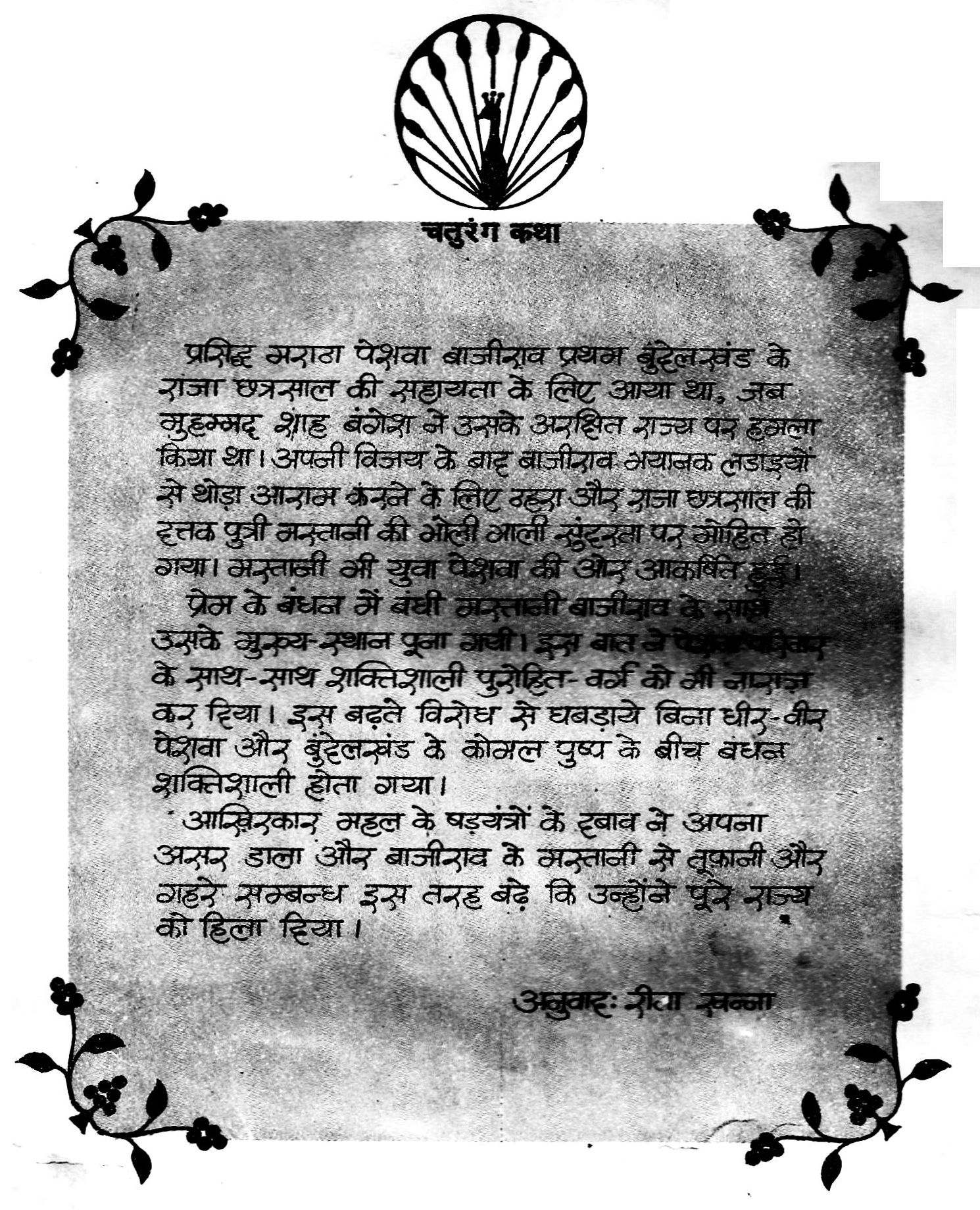 प्रसिद्ध मराठा पेशवा बाजीराव प्रथम बुंदेलखंड के राजा छत्रसाल की सहायता के लिए आया था, जब मुहम्मद शाह बंगेश ने उसके अरक्षित राज्य पर हमला किया था। अपनी विजय के बाद बाजीराव भयानक लड़ाइयों से थोड़ा आराम करने के लिए ठहरा और राजा छत्रसाल की इत्तक पुत्री मस्तानी की भोली भाली सुंदरता पर मोहित हो गया। मस्तानी भी युवा पेशवा की ओर आकर्षित प्रेम के बंधन में बंधी मस्तानी बाजीराव के सा उसके मुख्य स्थान पूजा गयी। इस बाल ले पिशाजा परिवार के साथ-साथ शक्तिशाली पुरोहित वर्ग को भी नाराज़ कर दिया। इस बढ़ते विरोध से घबड़ाये बिना धीर-वीर पेशवा और बुंदेलखंड के कोमल पुष्प के बीच बंधन शक्तिशाली होता गया। आखिरकार महल के षड़यंत्रों के दबाव ने अपना असर डाला और बाजीराव के मस्तानी से तूफ़ानी और गहरे सम्बन्ध इस तरह बढ़े कि उन्होंने पूरे राज्य को हिला दिया।