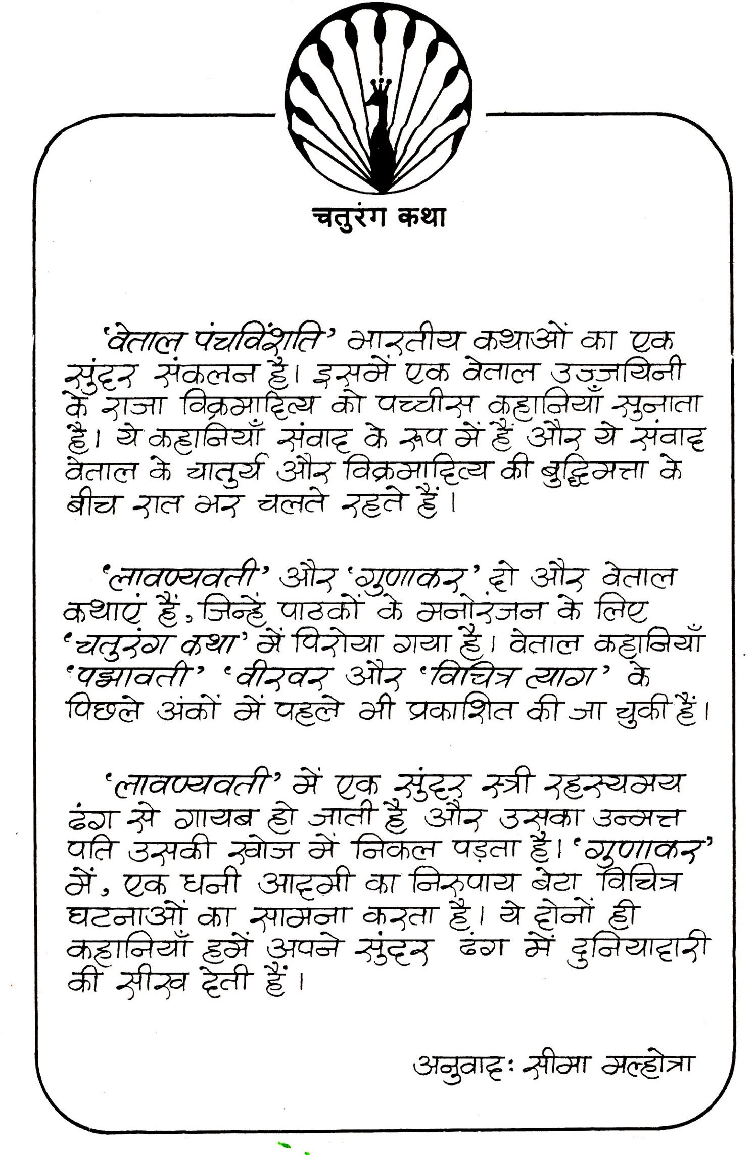 'वेताल पंचविंशति' भारतीय कथाओं का एक सुंदर संकलन है। इसमें एक वेताल उज्जयिनी के राजा विक्रमादित्य को पच्चीस कहानियाँ सुनाता है। ये कहानियाँ संवाद के रूप में हैं और ये संवाह वेताल के चातुर्य और विक्रमादित्य की बुद्धिमत्ता के बीच रात भर चलते रहते हैं। 'लावण्यवती' और 'गुणाकर' दो और वेताल कथाएं हैं, जिन्हें पाठकों के मनोरंजन के लिए 'चतुरंग कथा' में पिरोया गया है। वेताल कहानियाँ 'पद्मावती' 'वीरवर और 'विचित्र त्याग' के पिछले अंकों में पहले भी प्रकाशित की जा चुकी हैं। 'लावण्यवती' में एक सुंदर स्त्री रहस्यमय ढंग से गायब हो जाती है और उसका उन्मत्त पति उसकी खोज में निकल पड़ता है। 'गुणाकर' में, एक धनी आदमी का निरुपाय बेटा विचित्र घटनाओं का सामना करता है। ये दोनों ही कहानियाँ हमें अपने सुंदर ढंग में दुनियादारी की सीख देती हैं।