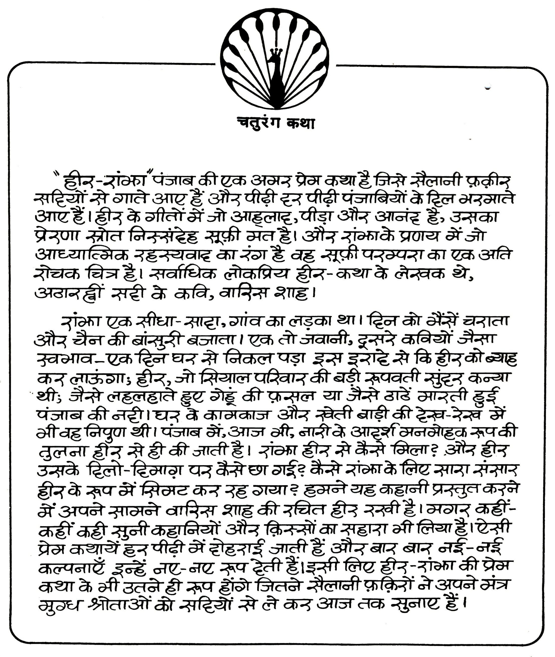 'हीर-रांझा पंजाब की एक अमर प्रेम कथा है जिसे सैलानी फ़क़ीर् सहियों से गाते आए हैं और पीढ़ी हर पीढ़ी पंजाबियों के दिल भरमाते आए हैं। हीर के गीतों में जो आहलाह, पीड़ा और आनंद है, उसका प्रेरणा स्रोत निस्संदेह सूफ़ी मत है। और रांका के प्रणय में जो आध्यात्मिक रहस्यवाद का रंग है वह सूफ़ी परम्परा का एक अति रोचक चित्र है। सर्वाधिक लोकप्रिय हीर- कथा के लेखक थे, अठारह्नीं सही के कवि, वारिस शाह। रांझा एक सीधा-सादा, गांव का लड़का था। हिन को भैंसें चराता और चैन की बांसुरी बजाता। एक तो जवानी, दूसरे कवियों जैसा स्वभाव-एक हिन घर से निकल पड़ा इस इरादे से कि हीर को ब्याह कर लाऊंगा, हीर, जो सियाल परिवार की बड़ी रूपवती सुंदर कन्या थी; जैसे लहलहाते हुए गेहूं की फसल या जैसे ठाठें मारती हुई पंजाब की नही। घर के कामकाज और खेती बाड़ी की देख-रेख में भी वह निपुण थी। पंजाब में, आज भी, नारी के आदर्श मनमोहक रूप की तुलना हीर से ही की जाती है। रांभा हीर से कैसे मिला? और हीर उसके हिलो-दिमाग़ पर कैसे छा गई? कैसे रांका के लिए सारा संसार हीर के रूप में सिमट कर रह गया? हमने यह कहानी प्रस्तुत करने में अपने सामने वारिस शाह की रचित हीर रखी है। मगर कहीं- कहीं कही सुनी कहानियों और क़िस्सों का सहारा भी लिया है। ऐसी प्रेम कथायें हर पीढ़ी में होहराई जाती हैं और बार बार नई-नई कल्पनाएँ इन्हें नए-नए रूप देती हैं। इसी लिए हीर-रांझा की प्रेम कथा के भी उतने ही रूप होंगे जितने सैलानी फ़क़िरों ने अपने मंत्र मुग्ध श्रोताओं को सहियों से ले कर आज तक सुनाए हैं।