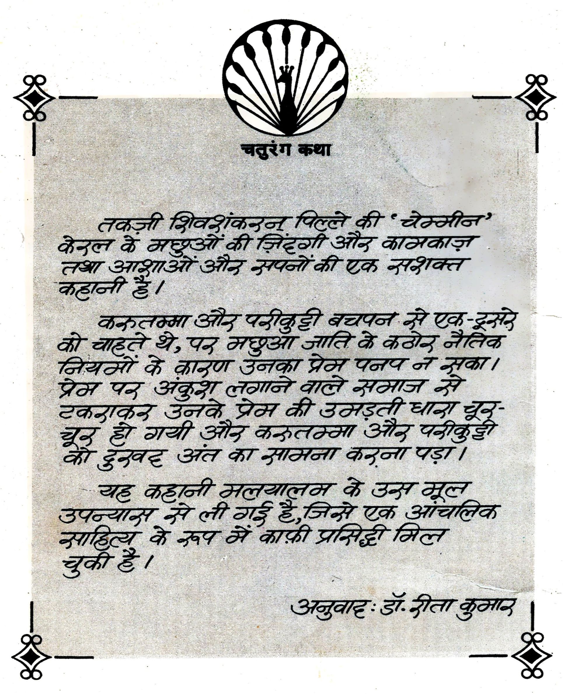 तकज़ी शिवशंकरन पिल्ले की 'चेम्मीन' केरल के मछुओं की ज़िंदगी और कामकाज़ तथा आशाओं और सपनों की एक सशक्त कहानी है। करुतम्मा और परीकुट्टी बचपन से एक-दूसरे को चाहते थे, पर मछुआ जाति के कठोर नैतिक नियमों के कारण उनका प्रेम पनप न सका। प्रेम पर अंकुश लगाने वाले समाज से टकराकर उनके प्रेम की उमड़ती धारा चूर- चूर हो गयी और करुतम्मा और परीकुट्टी को दुखद अंत का सामना करना पड़ा। यह कहानी मलयालम के उस मूल उपन्यास से ली गई है, जिसे एक आंचलिक साहित्य के रूप में काफ़ी प्रसिद्धी मिल चुकी है।
