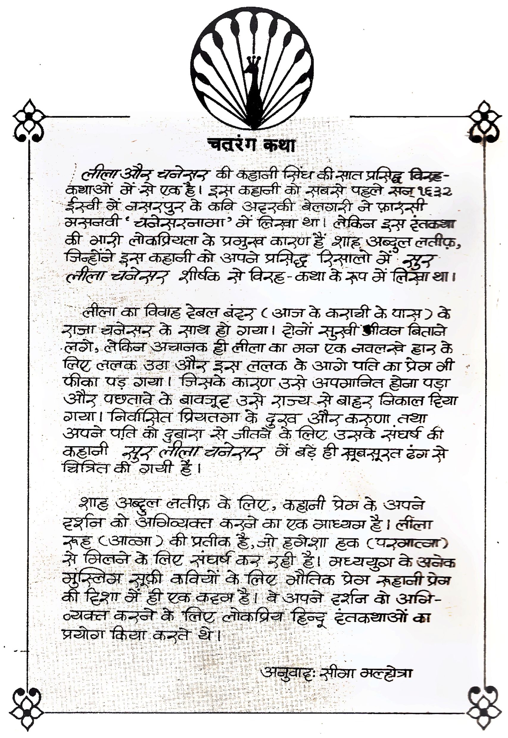 लीला और चनेसर की कहानी सिंघ की सात प्रसिद्ध विरह- कथाओं में से एक है। इस कहानी को सबसे पहले सन् 1632 ईस्वी में नसरपुर के कवि अदरकी बेलगरी ने फ़ारसी मसनवी' चनेसरनामा' में लिखा था। लेकिन इस दंतकथा की भारी लोकप्रियता के प्रमुख कारण हैं शाह अब्दुल लतीफ़, जिन्होंने इस कहानी को अपने प्रसिद्ध रिसालो में सुर लीला चनेसर शीर्षक से विरह कथा के रूप में लिखा था। लीला का विवाह टेबल बंदर (आज के कराची के पास) के राजा चनेसर के साथ हो गया। दोनों सुखी जीवन बिताने लगे, लेकिन अचानक ही लीला का मन एक नवलखे हार के लिए ललक उठा और इस ललक के आगे पति का प्रेम भी फीका पड़ गया। जिसके कारण उसे अपमानित होना पड़ा और पछतावे के बावजूद उसे राज्य से बाहर निकाल दिया गया। निर्वासित प्रियतमा के दुख और करुणा तथा अपने पति को दुबारा से जीतने के लिए उसके संघर्ष की कहानी सुर लीला चनेसर में बड़े ही खूबसूरत ढंग से चित्रित की गयी है। शाह अब्दुल लतीफ़ के लिए, कहानी प्रेम के अपने दर्शन को अभिव्यक्त करने का एक माध्यम है। लीला रूह (आत्मा) की प्रतीक है, जो हमेशा हक (परमात्मा) से मिलने के लिए संघर्ष कर रही है। मध्ययुग के अनेक मुस्लिम सूफ़ी कवियों के लिए भौतिक प्रेम रूहानी प्रेम की दिशा में ही एक कट्टम है। वे अपने दर्शन को अभि- व्यक्त करने के लिए लोकप्रिय हिन्दू दंतकथाओं का प्रयोग किया करते थे।