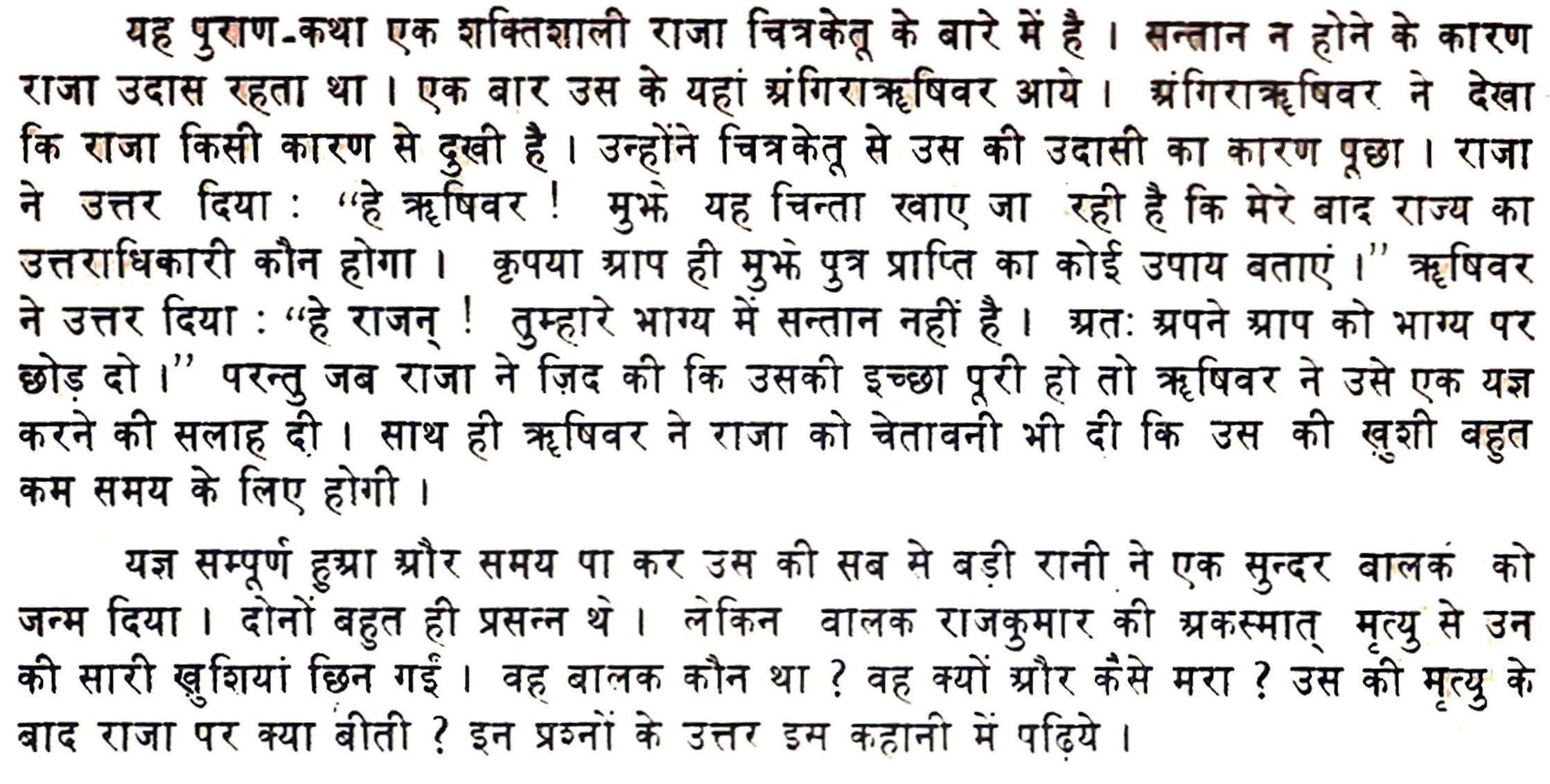 यह पुराण-कथा एक शक्तिशाली राजा चित्रकेतू के बारे में है । सन्तान न होने के कारण राजा उदास रहता था। एक बार उस के यहां अंगिराऋषिवर आये। अंगिराऋषिवर ने देखा कि राजा किसी कारण से दुखी है। उन्होंने चित्रकेतू से उस की उदासी का कारण पूछा। राजा ने उत्तर दिया : "हे ऋषिवर ! मुझे यह चिन्ता खाए जा रही है कि मेरे बाद राज्य का उत्तराधिकारी कौन होगा। कृपया आप ही मुझे पुत्र प्राप्ति का कोई उपाय बताएं।" ऋषिवर ने उत्तर दिया : “हे राजन् ! तुम्हारे भाग्य में सन्तान नहीं है। अतः अपने आप को भाग्य पर छोड़ दो।” परन्तु जब राजा ने ज़िद की कि उसकी इच्छा पूरी हो तो ऋषिवर ने उसे एक यज्ञ करने की सलाह दी। साथ ही ऋषिवर ने राजा को चेतावनी भी दी कि उस की खुशी बहुत कम समय के लिए होगी। यज्ञ सम्पूर्ण हुआ और समय पा कर उस की सब से बड़ी रानी ने एक सुन्दर बालक को जन्म दिया। दोनों बहुत ही प्रसन्न थे। लेकिन वालक राजकुमार की अकस्मात् मृत्यु से उन की सारी खुशियां छिन गईं। वह बालक कौन था? वह क्यों और कैसे मरा? उस की मृत्यु के बाद राजा पर क्या बीती? इन प्रश्नों के उत्तर इस कहानी में पढ़िये।
