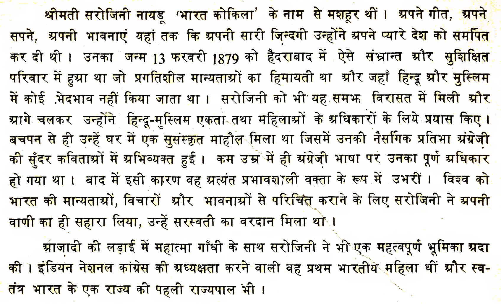 श्रीमती सरोजिनी नायडू 'भारत कोकिला' के नाम से मशहूर थीं। अपने गीत, अपने सपने, अपनी भावनाएं यहां तक कि अपनी सारी जिन्दगी उन्होंने अपने प्यारे देश को सर्पित कर दी थी। उनका जन्म 13 फरवरी 1879 को हैदराबाद में ऐसे संभ्रान्त और सुशिक्षित परिवार में हुआ था, जो प्रगतिशील मान्यताओं का हिमायती था और जहाँ हिन्दू और मुस्लिम में कोई भेदभाव नहीं किया जाता था। सरोजिनी को भी यह समझ विरासत में मिली और आगे चलकर उन्होंने हिन्दू-मुस्लिम एकता तथा महिलाओं के अधिकारों के लिये प्रयास किए। बचपन से ही उन्हें घर में एक सुसंस्कृत माहौल मिला था जिसमें उनकी नैसर्गिक प्रतिभा अंग्रेजी की सुंदर कविताओं में अभिव्यक्त हुई। कम उम्र में ही अंग्रेजी भाषा पर उनका पूर्ण अधिकार हो गया था। बाद में इसी कारण वह अत्यंत प्रभावशाली वक्ता के रूप में उभरीं। विश्व को भारत की मान्यताओं, विचारों और भावनाओं से परिचित कराने के लिए सरोजिनी ने अपनी वाणी का ही सहारा लिया, उन्हें सरस्वती का वरदान मिला था। आजादी की लड़ाई में महात्मा गाँधी के साथ सरोजिनी ने भी एक महत्वपूर्ण भूमिका अदा की। इंडियन नेशनल कांग्रेस की अध्यक्षता करने वाली वह प्रथम भारतीय महिला थीं और स्व-तंत्र भारत के एक राज्य की पहली राज्यपाल भी।