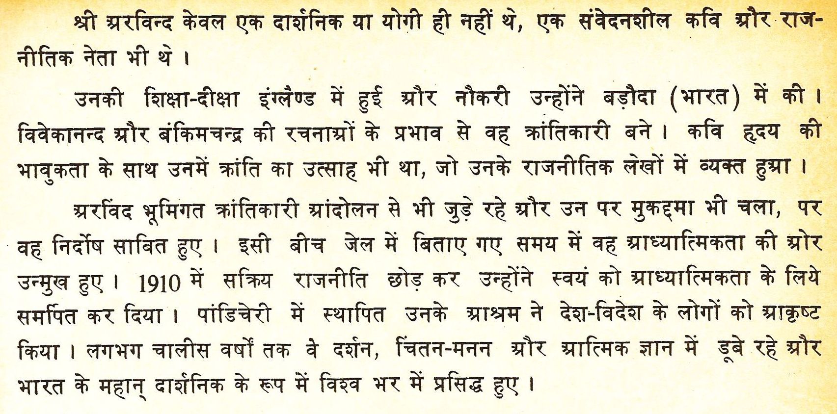 श्री अरविन्द केवल एक दार्शनिक या योगी ही नहीं थे, एक संवेदनशील कवि और राजनीतिक नेता भी थे। उनकी शिक्षा-दीक्षा इंग्लैण्ड में हुई और नौकरी उन्होंने बड़ौदा (भारत) में की। विवेकानन्द और बंकिमचन्द्र की रचनाओं के प्रभाव से वह क्रांतिकारी बने। कवि हृदय की भावुकता के साथ उनमें क्रांति का उत्साह भी था, जो उनके राजनीतिक लेखों में व्यक्त हुआ। अरविंद भूमिगत क्रांतिकारी प्रांदोलन से भी जुड़े रहे और उन पर मुकद्दमा भी चला, पर वह निर्दोष साबित हुए। इसी बीच जेल में बिताए गए समय में वह प्राध्यात्मिकता की ओर उन्मुख हुए। 1910 में सक्रिय राजनीति छोड़ कर उन्होंने स्वयं को आध्यात्मिकता के लिये समर्पित कर दिया। पांडिचेरी में स्थापित उनके आश्रम ने देश-विदेश के लोगों को प्रकृष्ट किया। लगभग चालीस वर्षों तक वे दर्शन, चिंतन-मनन और आत्मिक ज्ञान में डूबे रहे और भारत के महान् दार्शनिक के रूप में विश्व भर में प्रसिद्ध हुए।