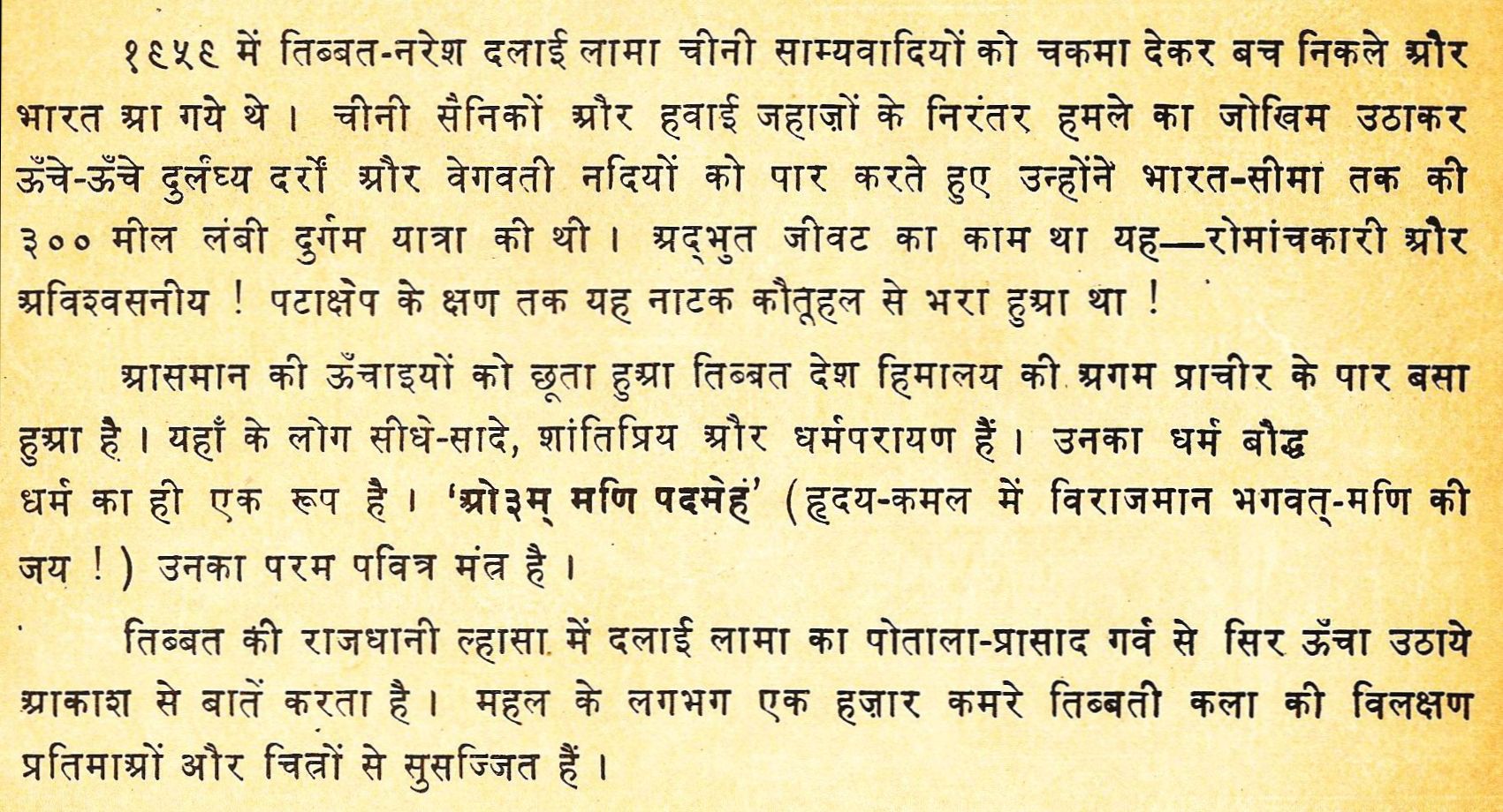 1956 में तिब्बत - नरेश दलाई लामा चीनी साम्यवादियों को चकमा देकर बच निकले और भारत आ गये थे। चीनी सैनिकों और हवाई जहाज़ों के निरंतर हमले का जोखिम उठाकर ऊँचे-ऊँचे दुर्लंघ्य दर्रों और वेगवती नदियों को पार करते हुए उन्होंने भारत-सीमा तक की 300 मील लंबी दुर्गम यात्रा की थी। अद्भुत जीवट का काम था यह रोमांचकारी और अविश्वसनीय! पटाक्षेप के क्षण तक यह नाटक कौतूहल से भरा हुआ था! प्रासमान की ऊँचाइयों को छूता हुआ तिब्बत देश हिमालय की अगम प्राचीर के पार बसा हुआ है। यहाँ के लोग सीधे-सादे, शांतिप्रिय और धर्मपरायण हैं । उनका धर्म बौद्ध धर्म का ही एक रूप है। 'ओ३म् मणि पदमेह' (हृदय - कमल में विराजमान भगवत्-मणि की जय !) उनका परम पवित्र मंत्र है। तिब्बत की राजधानी ल्हासा में दलाई लामा का पोताला प्रासाद गर्व से सिर ऊँचा उठाये आकाश से बातें करता है । महल के लगभग एक हज़ार कमरे तिब्बती कला की विलक्षण प्रतिमाओं और चित्रों से सुसज्जित हैं।