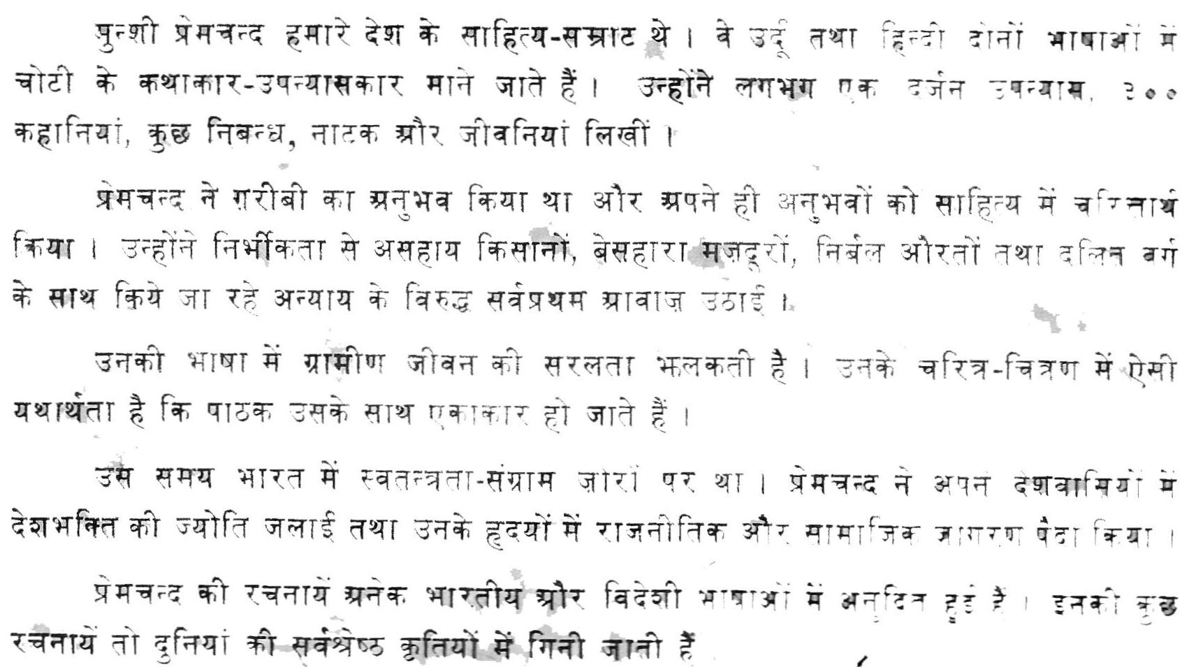 मुंशी प्रेमचंद हमारे देश के साहित्य-सम्राट थे। वे उर्दू तथा हिंदी दोनों भाषाओँ में चोटी के कथाकार-उपन्यासकार माने जाते हैं। उन्होंने लगभग एक दर्ज़न उपन्यास 300 कहानियां कुछ निबंध, नाटक और जीवनियाँ लिखी। प्रेमचंद ने गरीबी का अनुभव किया था और अपने ही अनुभवों को साहित्य में चरितार्थ किया। उन्होंने निर्भीकता से असहाय किसानो, बेसहारा मज़दूरों, निर्बल औरतों तथा दलित वर्ग के साथ किये जा रहे अन्याय के विरुद्ध सर्वप्रथम आवाज़ उठाई। उनकी भाषा में ग्रामीण जीवन की सरलता झलकती है। उनके चरित्र चित्रण में ऐसी यथार्थता है की पाठक उसके साथ एकाकार हो जाते हैं |उस समय भारत में स्वतंत्रता-संग्राम जोरों पर था प्रेमचंद ने अपने देशवासियों में देशभक्ति की ज्योति जलाई तथा उनके हृदयों में राजनैतिक और सामाजिक जागरण पैदा किया। प्रेमचंद की रचनाएं तो दुनिया की सर्वश्रेष्ठ कृतियों में गिनी जाती है।