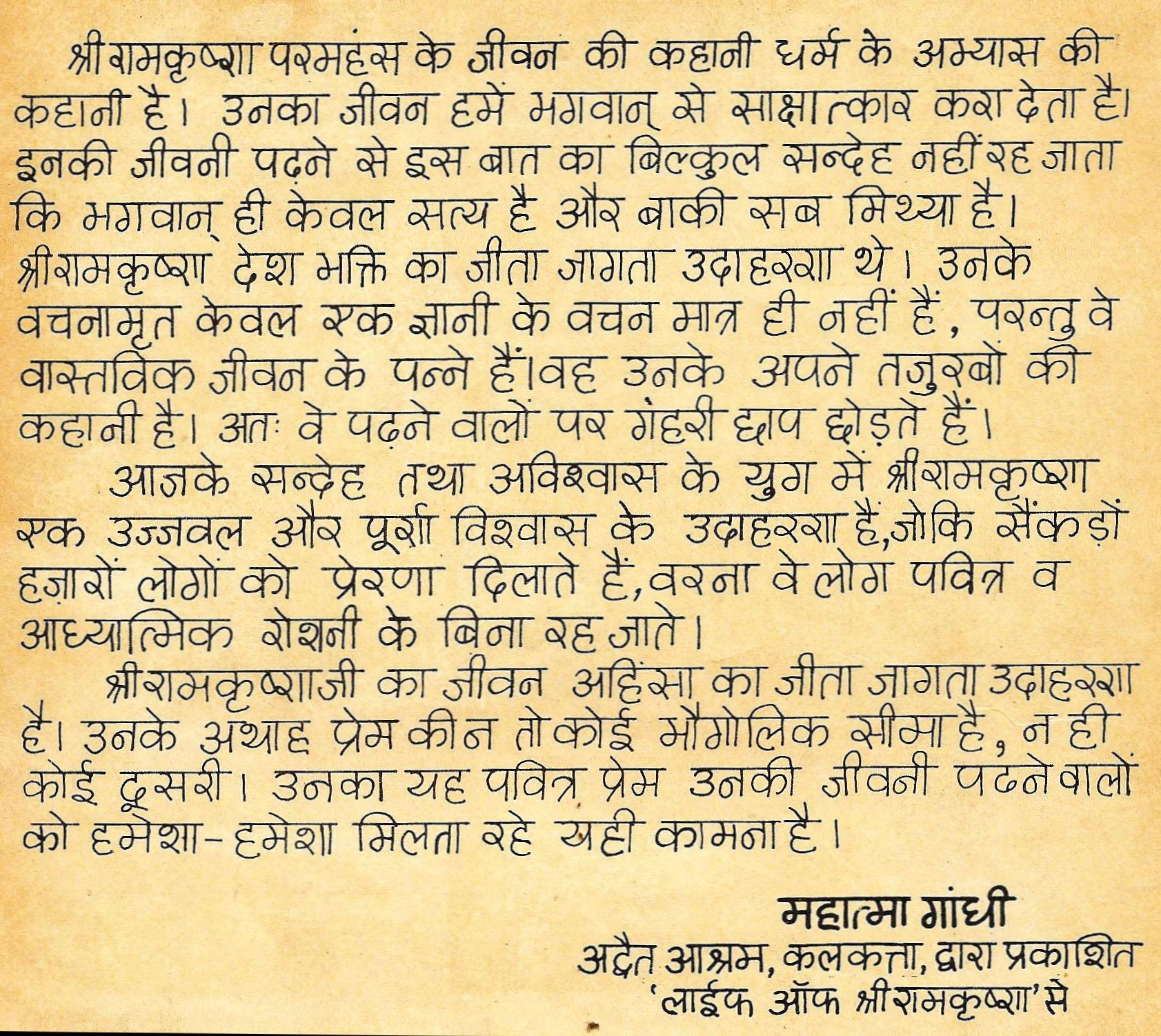 श्री रामकृष्णा परमहंस के जीवन की कहानी धर्म के अभ्यास की कहानी है। उनका जीवन हमें भगवान् से साक्षात्कार करा देता है। इनकी जीवनी पढ़ने से इस बात का बिल्कुल सन्देह नहीं रह जाता कि भगवान् ही केवल सत्य है और बाकी सब मिथ्या है। श्रीरामकृष्णा देश भक्ति का जीता जागता उदाहरगा थे। उनके वचनामृत केवल एक ज्ञानी के वचन मात्र ही नहीं हैं, परन्तु वे वास्तविक जीवन के पन्ने हैं। वह उनके अपने तजुरबों की कहानी है। अतः वे पढ़ने वालों पर गहरी छाप छोड़ते हैं। आजके सन्देह तथा अविश्वास के युग में श्री रामकृष्ण एक उज्जवल और पूरा विश्वास के उदाहरणा हैं, जो कि सैंकड़ों हज़ारों लोगों को प्रेरणा दिलाते हैं, वरना वे लोग पवित्र व आध्यात्मिक रोशनी के बिना रह जाते। श्री रामकृष्णाजी का जीवन अहिंसा का जीता जागता उदाहरणा है। उनके अथाह प्रेम की न तो कोई भौगोलिक सीमा है, न ही कोई दूसरी । उनका यह पवित्र प्रेम उनकी जीवनी पढने वालों को हमेशा-हमेशा मिलता रहे यही कामना है।
