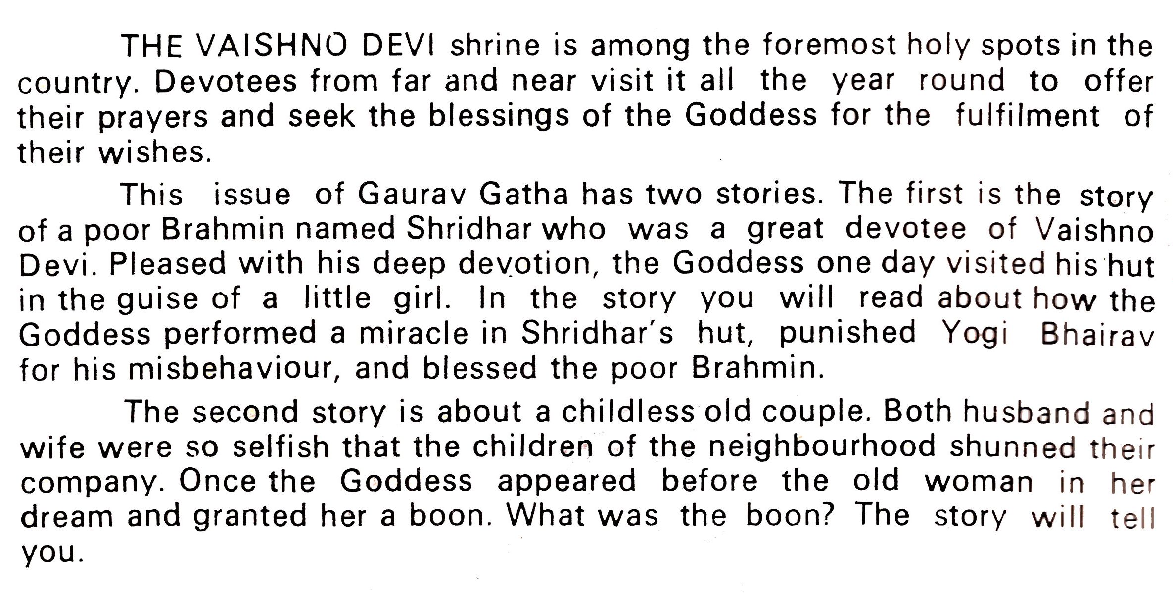 THE VAISHNO DEVI shrine is among the foremost holy spots in the country. Devotees from far and near visit it all the year round to offer their prayers and seek the blessings of the Goddess for the fulfilment of their wishes. This issue of Gaurav Gatha has two stories. The first is the story of a poor Brahmin named Shridhar who was a great devotee of Vaishno Devi. Pleased with his deep devotion, the Goddess one day visited his hut in the guise of a little girl. In the story you will read about how the Goddess performed a miracle in Shridhar's hut, punished Yogi Bhairav for his misbehaviour, and blessed the poor Brahmin.