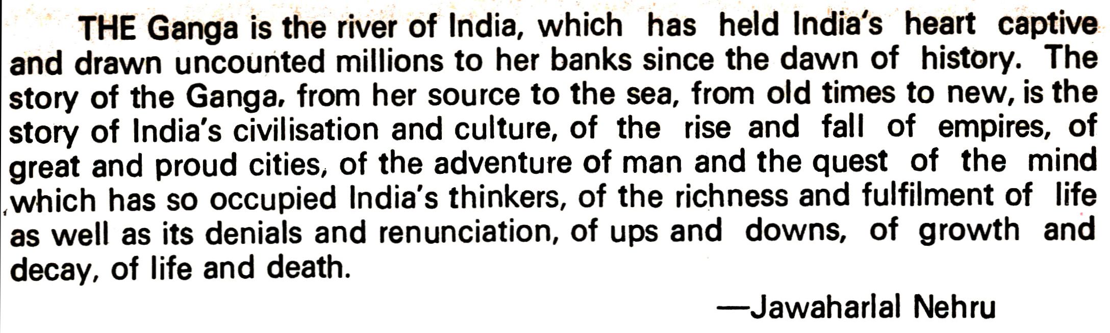 THE Ganga is the river of India, which has held India's heart captive and drawn uncounted millions to her banks since the dawn of history. The story of the Ganga, from her source to the sea, from old times to new, is the story of India's civilisation and culture, of the rise and fall of empires, of great and proud cities, of the adventure of man and the quest of the mind which has so occupied India's thinkers, of the richness and fulfilment of life as well as its denials and renunciation, of ups and downs, of growth and decay, of life and death.