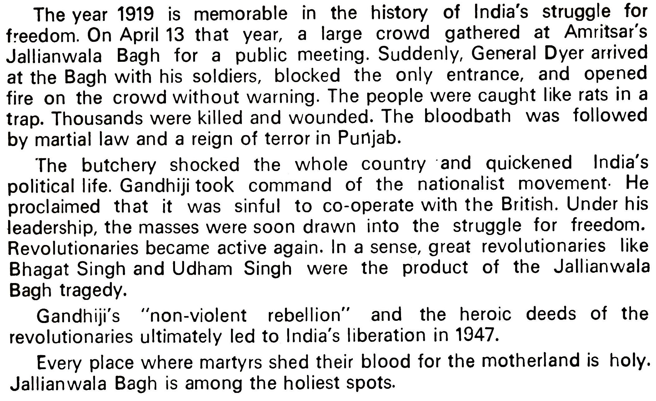 The year 1919 is memorable in the history of India's struggle for freedom. On April 13 that year, a large crowd gathered at Amritsar's Jallianwala Bagh for a public meeting. Suddenly, General Dyer arrived at the Bagh with his soldiers, blocked the only entrance, and opened fire on the crowd without warning. The people were caught like rats in a trap. Thousands were killed and wounded. The bloodbath was followed by martial law and a reign of terror in Punjab. The butchery shocked the whole country and quickened India's political life. Gandhiji took command of the nationalist movement. He proclaimed that it was sinful to co-operate with the British. Under his leadership, the masses were soon drawn into the struggle for freedom. Revolutionaries became active again. In a sense, great revolutionaries like Bhagat Singh and Udham Singh were the product of the Jallianwala Bagh tragedy.