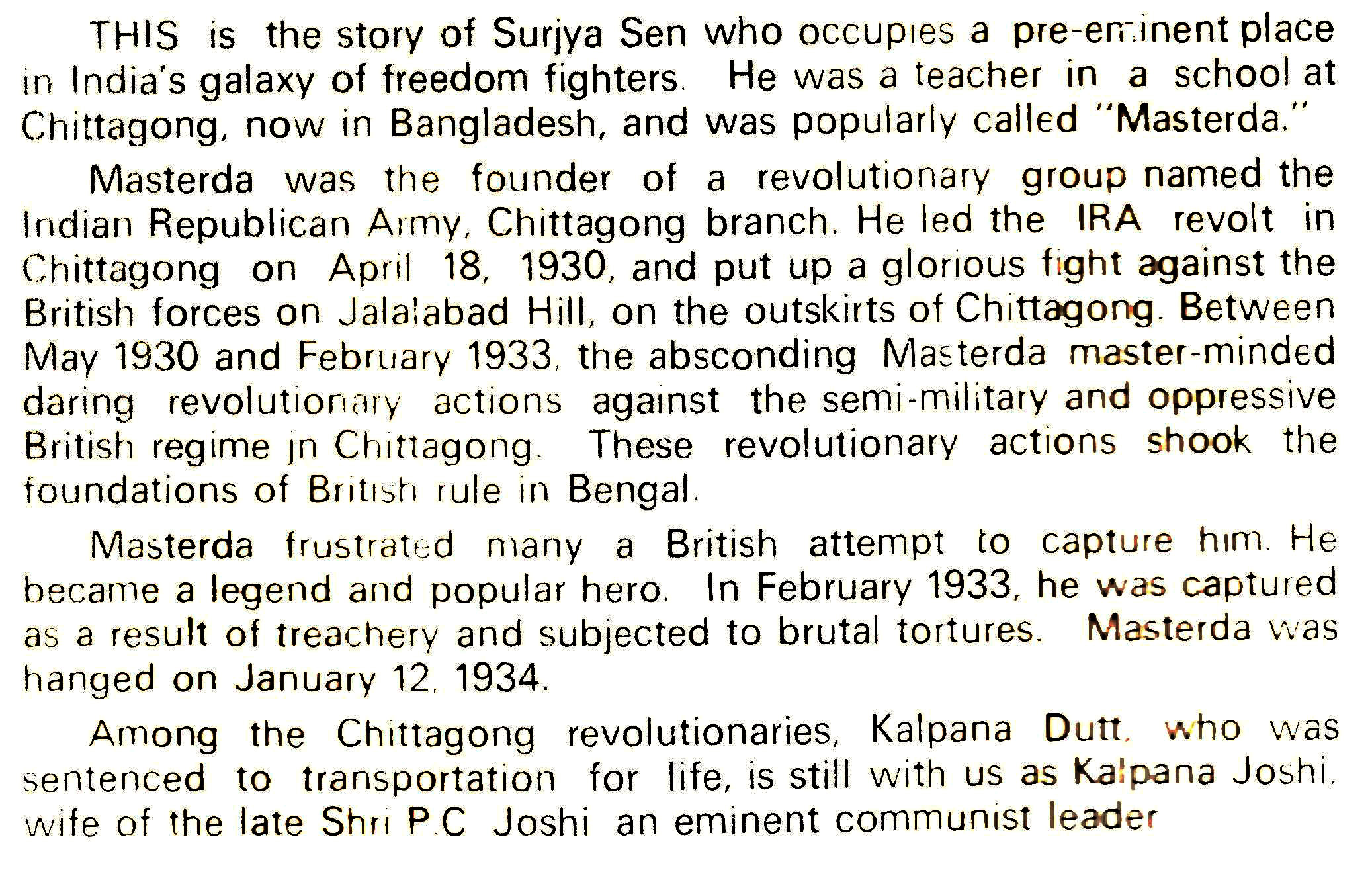 THIS is the story of Surjya Sen who occupies a pre-eminent place in India's galaxy of freedom fighters. He was a teacher in a school at Chittagong, now in Bangladesh, and was popularly called "Masterda." Masterda was the founder of a revolutionary group named the Indian Republican Army, Chittagong branch. He led the IRA revolt in Chittagong on April 18, 1930, and put up a glorious fight against the British forces on Jalalabad Hill, on the outskirts of Chittagong. Between May 1930 and February 1933, the absconding Masterda master-minded daring revolutionary actions against the semi-military and oppressive British regime in Chittagong. These revolutionary actions shook the foundations of British rule in Bengal. Masterda frustrated many a British attempt to capture him. He became a legend and popular hero. In February 1933, he was captured as a result of treachery and subjected to brutal tortures. Masterda was hanged on January 12, 1934. Among the Chittagong revolutionaries, Kalpana Dutt, who was sentenced to transportation for life, is still with us as Kalpana Joshi, wife of the late Shri P.C Joshi an eminent communist leader.
