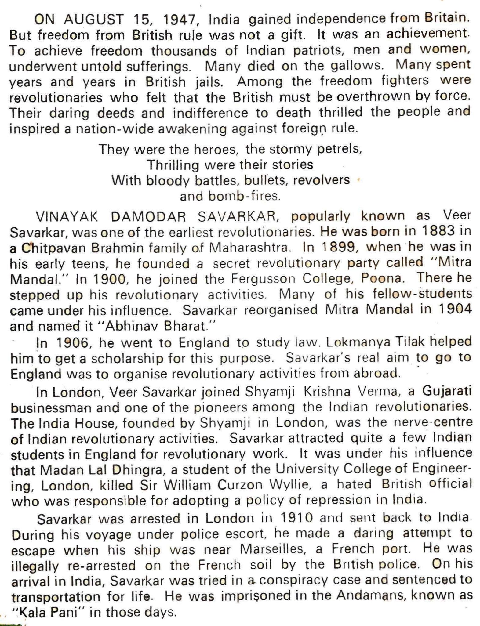 VINAYAK DAMODAR SAVARKAR, popularly known as Veer Savarkar, was one of the earliest revolutionaries. He was born in 1883 in a Chitpavan Brahmin family of Maharashtra. In 1899, when he was in his early teens, he founded a secret revolutionary party called "Mitra Mandal." In 1900, he joined the Fergusson College, Poona. There he stepped up his revolutionary activities. Many of his fellow-students came under his influence. Savarkar reorganised Mitra Mandal in 1904 and named it "Abhinav Bharat." In 1906, he went to England to study law. Lokmanya Tilak helped him to get a scholarship for this purpose. Savarkar's real aim to go to England was to organise revolutionary activities from abroad. In London, Veer Savarkar joined Shyamji Krishna Verma, a Gujarati businessman and one of the pioneers among the Indian revolutionaries. The India House, founded by Shyamji in London, was the nerve-centre of Indian revolutionary activities. Savarkar attracted quite a few Indian. students in England for revolutionary work. It was under his influence that Madan Lal Dhingra, a student of the University College of Engineer- ing, London, killed Sir William Curzon Wyllie, a hated British official who was responsible for adopting a policy of repression in India. Savarkar was arrested in London in 1910 and sent back to India. During his voyage under police escort, he made a daring attempt to escape when his ship was near Marseilles, a French port. He was illegally re-arrested on the French soil by the British police. On his arrival in India, Savarkar was tried in a conspiracy case and sentenced to transportation for life. He was imprisoned in the Andamans, known as "Kala Pani" in those days.